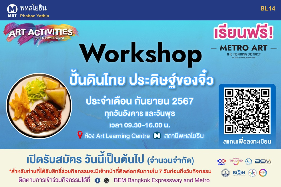 โดยกิจกรรมจะถูกจัดขึ้นทุกวันอังคารและวันพุธตลอดเดือนกันยายน เวลา 09.30 – 16.00 น. ณ ห้อง Art Learning Centre ที่ Metro Mall ชั้นร้านค้ารถไฟฟ้า MRT สถานีพหลโยธิน ผู้สนใจสามารถสมัครเข้าร่วมกิจกรรมล่วงหน้าได้ฟรี !! ตั้งแต่วันนี้เป็นต้นไป (รับจำนวนจำกัด) ผ่านทาง QR Code หรือ https://citly.me/8TeEv สามารถติดตามรายละเอียดเพิ่มเติมได้ที่ Facebook (เฟซบุ๊ก) และ X (เอ็กซ์) : BEM Bangkok Expressway and Metro