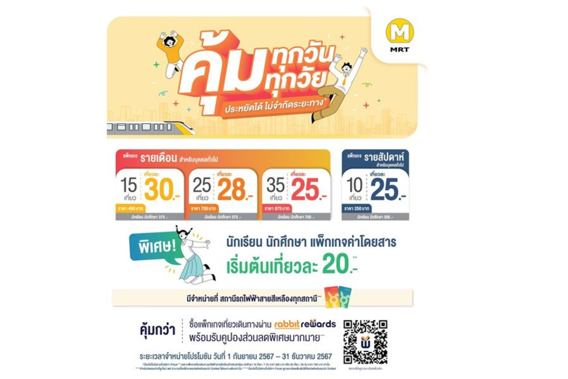 บริษัท อีสเทิร์น บางกอกโมโนเรล จำกัด (EBM) ผู้รับสัมปทานรถไฟฟ้ามหานครสายนัคราพิพัฒน์ (สายสีเหลือง) เปิดตัวโปรโมชันใหม่ แพ็กเกจเที่ยวเดินทางรายเดือนและแพ็กเกจราคาพิเศษสำหรับนักเรียน-นักศึกษา ให้เลือกใช้ตามไลฟ์สไตล์ พร้อมขยายโปรโมชันรายสัปดาห์ โดยสามารถซื้อแพ็กเกจได้ 2 ช่องทาง คือ ห้องจำหน่ายบัตรโดยสาร รถไฟฟ้ามหานคร สายสีเหลือง ทุกสถานี และแอปพลิเคชันแรบบิท รีวอร์ดส (Rabbit Rewards) เริ่มจำหน่ายตั้งแต่วันที่ 1 กันยายน 2567 – 31 ธันวาคม 2567