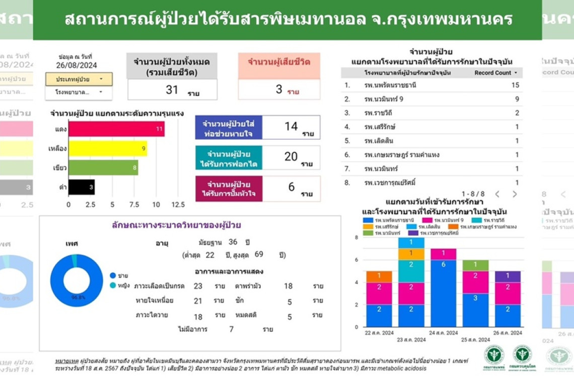 ล่าสุด เวลา 19.00 น. มีรายงานว่า ตั้งแต่วันที่ 22-26 ส.ค.67 มีผู้ป่วยที่เข้ารับการรักษาในโรงพยาบาล ทั้งสิ้น 31 ราย ในจำนวนนี้มีผู้เสียชีวิต 3 ราย โดยแบ่งพักรักษาตัวที่โรงพยาบาลนพรัตน์ราธานี 15 ราย (เสียชีวิต 1 ราย) , โรงพยาบาลนวมินทร์ 9 จำนวน 9 ราย (เสียชีวิต 1 ราย) , โรงพยาบาลราชวิถี 2 ราย, โรงพยาบาลเสรีรักษ์ 1 ราย (เสียชีวิต 1 ราย), โรงพยาบาลเลิดสิน 1 ราย, โรงพยาบาลเกษมราษฎร์รามคำแหง 1 ราย, โรงพยาบาลนวมินทร์ 1 ราย และโรงพยาบาลเวชการุณย์รัศมิ์ 1 ราย