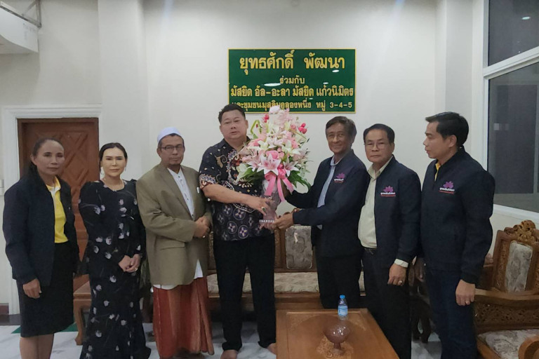 นายยุทธศักดิ์ ชูประเสริฐ กล่าวว่า ผมและทีมงานยุทธศักดิ์พัฒนาได้ลงพื้นที่ชุมชนมุสลิมเพื่อรับฟังปัญหาพบว่ามีปัญหาหลายอย่างที่พี่น้องต้องการให้มาแก้ไขในเบื่องต้นได้ดำเนินการสนับสนุนงานประเพณีต่างๆ ปรับปรุงซ่อมแซมสาธารณูปโภคของชาวชุมชนแก้วนิมิต บางส่วนได้นำเครื่องจักรลงมาปรับปรุงผิวถนนก็สามารถดำเนินการได้ไปหลายซอยแล้ว ตัดหญ้า ฉีดยุง ลอกคลองในส่วนที่เราทำได้เราใช้เครื่องจักรของเราเอง วันนี้ได้มาพบกับโต๊ะอีหม่านทั้ง 2 มัสยิด ทั้งกรรมการชุมชน สท.ในพื้นที่พร้อมกับ อดีต สท.รองนายก ที่ปรึกษาฯ รวมมือกันอะไรที่มีประโยชน์เราทำหมด เพราะว่าเป็นงบส่วนบุคคล พี่น้องชาวอิสลามชอบเราเพราะว่า เราพูดแล้วเราทำเลย ไม่ว่าจะเป็นงานบุญและงานขาวดำทีมงานเราก็มาร่วมช่วยเหลือและให้กำลังใจทุกเรื่อง อย่างวันนี้พบว่าถนนทางเข้ากุโบร์ที่ฝังศพได้รับการเสนอจาก สท.หมัดอา ให้เราปรับปรุงถนน ซึ่งเป็นงานถนัดของเรา ที่เราได้สร้างความเจริญให้พี่น้องชาวอำเภอคลองหลวงอยู่แล้ว