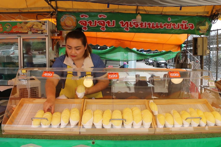 น.ส.มนัสนันท์ ผาสุข อายุ 38 ปีเจ้าของร้าน จุ๊บ จุ๊บ ทุเรียนแซบนัว กล่าวว่า ทุเรียนที่เข้ามาแข่งตอนนี้ส่วนมากจะเป็นของเวียดนามซึ่งมีราคาถูก แต่จากการทดสอบทุเรียนที่ปลูกในประเทศไทยทั่วทุกภูมิภาค และแม้จะเป้นทุเรียนนอก ซึ่งเปรียบเทียบแล้ว ทั้ง สี กลิ่น และรสชาติ ต่างสู้ทุเรียนไทยไม่ได้ ร้านจึงจำหน่ายเพียงทุเรียนไทยเท่านั้น อีกทั้งในขณะนี้ทุเรียนออกผลผลิตเยอะ สินค้าเริ่มล้นตลาดทำให้ทุเรียนไทยมีราคาถูกลง