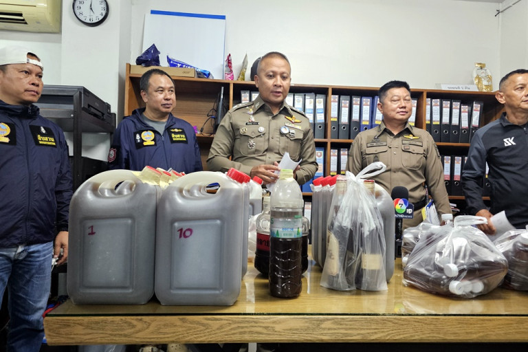 เมื่อเวลา 16.00 น. วันที่ 27 ส.ค.67 ที่ศูนย์ปฎิบัติการฝ่ายสืบสวน สน.มีนบุรี พล.ต.ต.เกียรติกุล สนธิเณร ผบก.น.3 พร้อมด้วย พ.ต.อ.กฤษ ก้อมน้อย ผกก.สน.มีนบุรี พ.ต.ท.จำนงค์ ประสพสุขมั่งดี รอง ผกก.สส.สน.มีนบุรี และฝ่ายสืบสวน สน.มีนบุรี ร่วมกันแถลงความคืบหน้าคดีผู้เสียชีวิตจากการดื่มยาดองมรณะ ภายหลังเข้าตรวจยึดสุรา (ยาดอง) บรรจุใส่แกลอน 16 แกลอน, ขวดพลาสติก กว่า 10 ขวด และโหลยาดอง 1 โหล โดยนำมาจากซุ้มยาดอง 2 จุด บริเวณซอยสามวา 1 และสามวา 11/1 เขตมีนบุรี กทม. เมื่อช่วงสายที่ผ่านมา