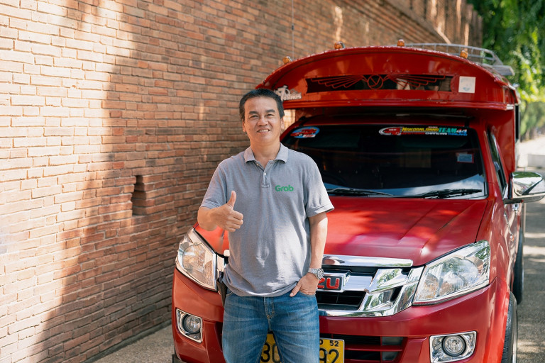พี่ไพรัช เผยว่า ในช่วงปีที่ผ่านมานักท่องเที่ยวเริ่มโบกเรียกรถแดงน้อยลง เนื่องจากความกังวลในราคาที่ไม่ชัดเจน หรือเคยโดนโก่งราคาแบบไม่สมเหตุสมผลมาก่อน ซึ่งในขณะที่เขากังวลว่าจะไปไม่รอด เป็นจังหวะเดียวกับที่แกร็บติดต่อเข้ามาผ่านสหกรณ์ เพื่อชวนคนขับรถแดงให้มาร่วมให้บริการผ่านแอปพลิเคชัน ซึ่งพี่ไพรัชก็ไม่รอช้า ตัดสินใจเข้าร่วมให้บริการผ่านแกร็บเป็นกลุ่มแรกๆ “ผมไม่เคยมีรายได้เยอะขนาดนี้มาก่อน จนได้ลองมารับผู้โดยสารกับแกร็บ” พี่ไพรัชกล่าว การเข้าให้บริการผ่านแอปพลิเคชันเพื่อหารายได้เสริมทำให้เขาเห็นแสงสว่างของการรักษาอาชีพที่เขารักเอาไว้
