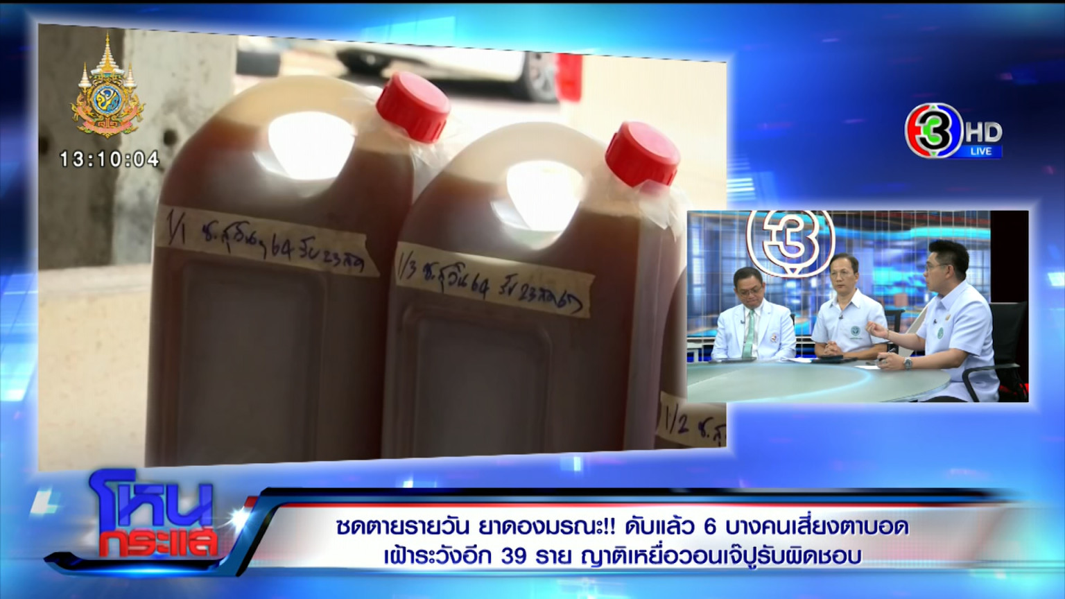 รายการโหนกระแส ออกอากาศวันที่ 28 ส.ค. 67 ดำเนินรายการโดย “หนุ่ม กรรชัย กำเนิดพลอย” ผลิตในนามบริษัท ดีคืนดีวัน จำกัด ออกอากาศทุกวันจันทร์-ศุกร์ เวลา 12.35 น. ทางช่อง 3 กดหมายเลข 33 สัมภาษณ์ ผักบุ้ง ลูกสาวที่สูญเสียพ่อจากการดื่มยาดอง, ยา สามีเสียชีวิต, ป้าหมอน สามีสมองตาย เป็นผู้ป่วยสีแดงเข้าขั้นวิกฤต, ป้าแอน รับยาดองมาขาย เสียใจมากกับเรื่องที่เกิดขึ้น , นพ.เกรียงไกร นามไธสง ผู้อำนวยการ รพ.นพรัตน์ราชธานี รักษาเคสผู้ป่วยยาดอง, นพ.ณัฐพงศ์ วงศ์วิวัฒน์ รองอธิบดีกรมการแพทย์ รวมทั้ง ดร.ธนกฤต จิตรอารีย์รัตน์ ที่ปรึกษารัฐมนตรีประจำกระทรวงสาธารณสุข