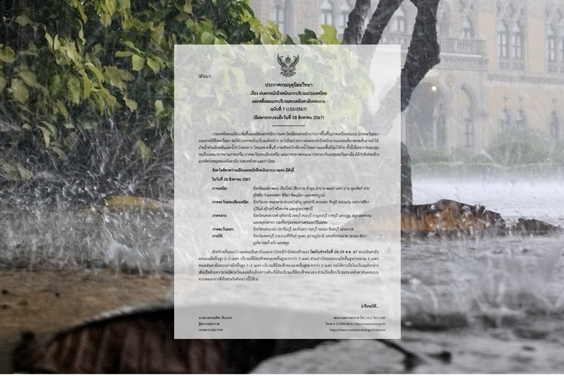 วันที่ 28 ส.ค.67 กรมอุตุนิยมวิทยา ได้ออกประกาศฉบับที่ 7 เรื่อง ฝนตกหนักถึงหนักมากบริเวณประเทศไทย และคลื่นลมแรงบริเวณทะเลอันดามันตอนบน (มีผลกระทบจนถึงวันที่ 28 สิงหาคม 2567) ความว่า...