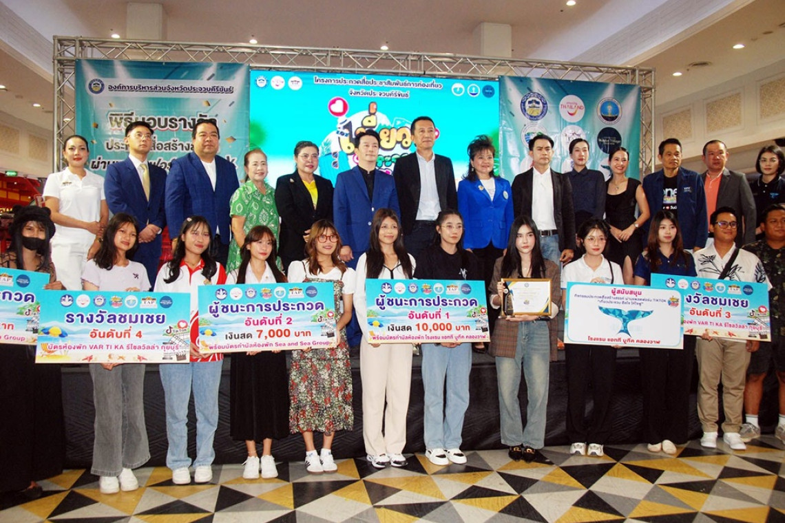 วันที่ 1 ก.ย.67 ที่ศูนย์การค้ามาร์เก็ตวิลเลจ หัวหิน จ.ประจวบฯ นายสราวุธ ลิ้มอรุณรักษ์ นายกองค์การบริหารส่วนจังหวัด (อบจ.) ประจวบฯ เป็นประธานในพิธีมอบรางวัลกิจกรรมประกวดสื่อสร้างสรรค์ผ่านแพลตฟอร์ม TikTok ภายใต้หัวข้อ “เที่ยวประจวบ อีลใจ ให้ใจฟู” มี นายทวีสิน พัฒนาภิรัส ประธานสภาองค์การบริหารส่วนจังหวัดประจวบฯ นางดวงใจ เสมแก้ว รองปลัด อบจ.ประจวบฯ ผู้ช่วยศาสตราจารย์ ดร.ภาสกร ศรีสุวรรณ อาจารย์สาขาวิชาเทคโนโลยีสื่อสารมวลชน มหาวิทยาลัยเทคโนโลยีราชมงคลรัตนโกสินทร์ วิทยาเขตวังไกลกังวล ดร.เรวิตา สายสุด คณะบริหารธุรกิจและเทคโนโลยี มหาวิทยาลัยนานาชาติแสตมฟอร์ด นางวาสนา ศรีกาญจนา นายกสมาคมธุรกิจการท่องเที่ยวหัวหิน/ชะอำ ศูนย์การค้ามาร์เก็ตวิลเลจ หัวหิน และแขกผู้มีเกียรติร่วมในพิธี