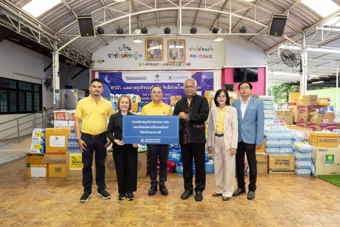 บริษัท กรุงเทพประกันภัย จำกัด (มหาชน) ร่วมสนับสนุนโครงการ คปภ. และภาคธุรกิจประกันภัย จับมือร่วมใจสานฝันน้อง ซึ่งจัดโดยสำนักงานคณะกรรมการกำกับและส่งเสริมการประกอบธุรกิจประกันภัย (คปภ.) สมาคมประกันวินาศภัยไทย และสมาคมประกันชีวิตไทย โดยนางรุจิรัตน์ ปัญญาเกียรติคุณ (ที่ 2 จากซ้าย) รองผู้อำนวยการ สำนักบริหารแบรนด์องค์กร เป็นผู้แทนบริษัทฯ มอบพัดลมจำนวน 10 เครื่อง รวมทั้งเวชภัณฑ์ที่จำเป็นให้แก่บ้านราชาวดี (ชาย-หญิง) ซึ่งได้รับเกียรติจากนายชูฉัตร ประมูลผล (ที่ 3 จากซ้าย) เลขาธิการ คปภ. เป็นประธานในพิธีรับมอบร่วมกับนายพิสิฐ พูลพิพัฒน์ (ที่ 3 จากขวา) รองอธิบดีกรมส่งเสริมและพัฒนาคุณภาพชีวิตคนพิการ เพื่อส่งเสริมคุณภาพชีวิตความเป็นอยู่ที่ดีให้แก่น้องๆ บ้านราชาวดี ณ บ้านราชาวดี จังหวัดนนทบุรี เมื่อวันที่ 2 กันยายน 2567