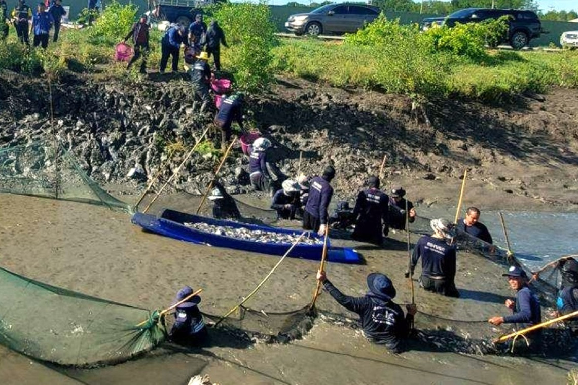 ด้านนายเผดิม รอดอินทร์ ประมงจังหวัดสมุทรสาคร กล่าวว่า จังหวัดสมุทรสาครได้ขับเคลื่อน 5 มาตรการกำจัดปลาหมอคางดำอย่างจริงจังตามแนวทาง “เจอ แจ้ง จับ จบ” บูรณาการความร่วมมือกับประมงพื้นบ้านตั้งกองเรืออวนรุน 33 ลำทำภารกิจล่าปลาหมอคางดำในแหล่งน้ำทั่วทั้งจังหวัดอย่างจริงจัง ผลจากการใช้เครื่องมือจับปลาที่มีประสิทธิภาพ และได้รับความร่วมมือจากแพปลา และโรงงานปลาป่นช่วยรับซื้อปลาที่จับได้ จนถึงวันนี้สมุทรสาครสามารถกำจัดปลาออกจากแหล่งน้ำแล้วมากกว่า 1.4 ล้านกิโลกรัม สะท้อนให้เห็นว่ามาตรการกำจัดปลาหมอคางดำของจังหวัดมีประสิทธิผลดี