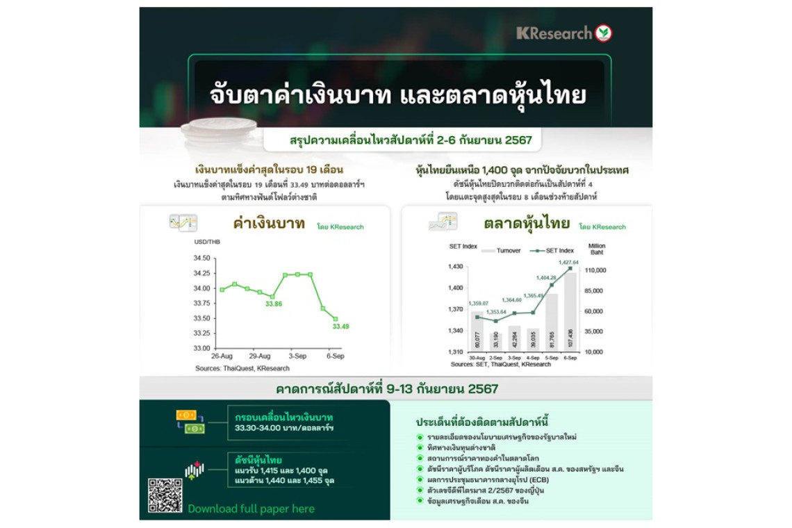 สัปดาห์ระหว่างวันที่ 9-13 ก.ย.2567 KBank คาดกรอบการเคลื่อนไหวของเงินบาทที่ 33.30-34.00 บาทต่อดอลลาร์ฯ ปัจจัยที่ต้องติดตาม ได้แก่ รายละเอียดของนโยบายเศรษฐกิจของรัฐบาลใหม่ ทิศทางเงินทุนต่างชาติ สถานการณ์ราคาทองคำในตลาดโลก ดัชนีราคาผู้บริโภคและดัชนีราคาผู้ผลิตเดือนส.ค. ของสหรัฐฯ และจีน ผลการประชุมธนาคารกลางยุโรป (ECB) ตลอดจนตัวเลขจีดีพีไตรมาส 2/2567 ของญี่ปุ่น