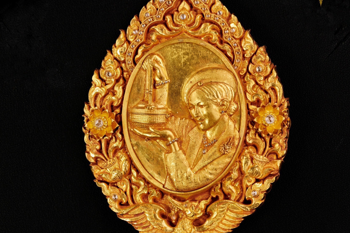 สมเด็จพระกนิษฐาธิราชเจ้า กรมสมเด็จพระเทพรัตนราชสุดาฯ สยามบรมราชกุมารี พระราชทานพระราชวโรกาสให้คณะผู้บริหารทองถนิมเข้าเฝ้าทูลละอองพระบาท เพื่อทูลเกล้าทูลกระหม่อมถวายผลงาน “อัคราภิรักษศิลปินแห่งแผ่นดินสยาม” เข็มกลัดทองคำสลักดุนพระบรมรูปสมเด็จพระนางเจ้าสิริกิติ์ พระบรมราชินีนาถ พระบรมราชชนนีพันปีหลวง ทรงถือกระเป๋าย่านลิเภา