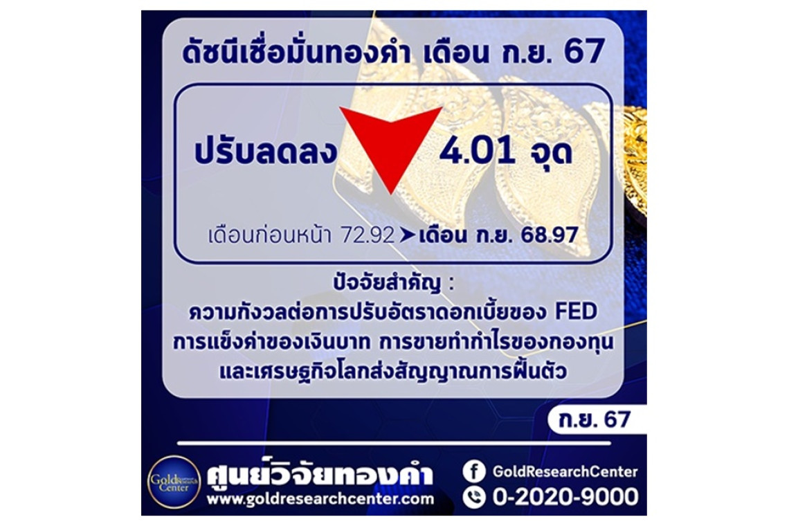 เมื่อวันที่ 11 ก.ย.67 นายพิบูลย์ฤทธิ์ วิริยะผล ผู้อำนวยการศูนย์วิจัยทองคำเปิดเผยว่า ดัชนีความเชื่อมั่นราคาทองคำประจำเดือน ก.ย.67 อยู่ที่ 68.97 จุด ปรับตัวลดลง 4.01 จุด หรือ 5.49% จากเดือน ส.ค.67 ที่ระดับ 72.98 จุด โดยมีปัจจัยจากความกังวลต่อการปรับอัตราดอกเบี้ยของธนาคารกลางสหรัฐฯ (เฟด), การแข็งค่าของเงินบาท, การขายทำกำไรของกองทุน และเศรษฐกิจโลกส่งสัญญาณการฟื้นตัว โดยคาดการณ์ความต้องการซื้อทองคำในช่วงเดือน ก.ย.67 จากกลุ่มตัวอย่างจำนวน 306 ราย พบว่า ในจำนวนนี้มี 144 ราย หรือ 47% คาดว่าจะซื้อทองคำ ส่วนจำนวน 90 ราย หรือ 29% คาดว่าจะไม่ซื้อทองคำ และจำนวน 72 ราย หรือ 24% ไม่แน่ใจว่าจะซื้อทองคำในเดือนนี้หรือไม่