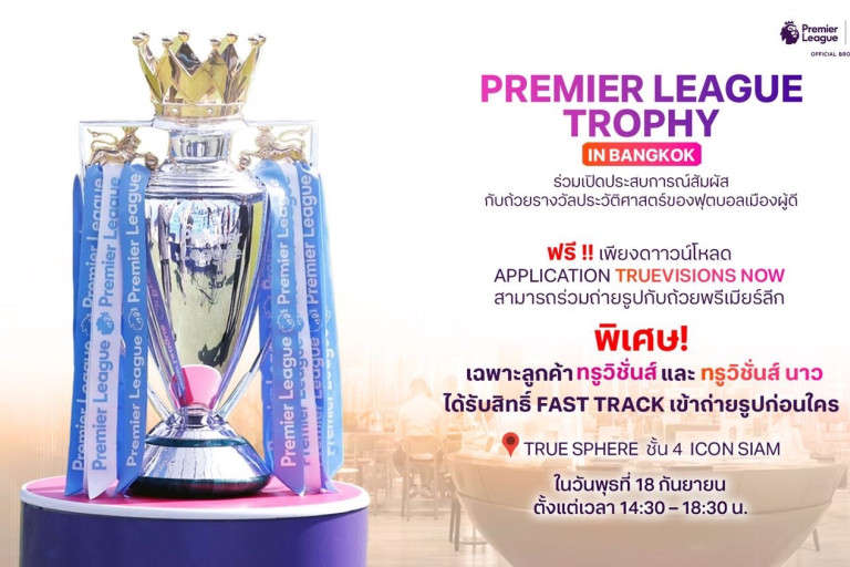 ทรูวิชั่นส์ เอาใจแฟนบอลไทย หัวใจพรีเมียร์ ลีก อีกครั้ง กับกิจกรรม “Premier League Trophy in Bangkok” ที่งานนี้ถ้วยจริง “Premier League Trophy” ส่งตรงจากแดนผู้ดี ประเทศอังกฤษ มาให้แฟน ๆ ได้ร่วมสัมผัสประสบการณ์สุดพิเศษ ในวันพุธที่ 18 กันยายนนี้ วันเดียวเท่านั้น ที่ True Sphere ชั้น 4 ไอคอน สยาม ตั้งแต่เวลา 14.30 – 18.30 น.