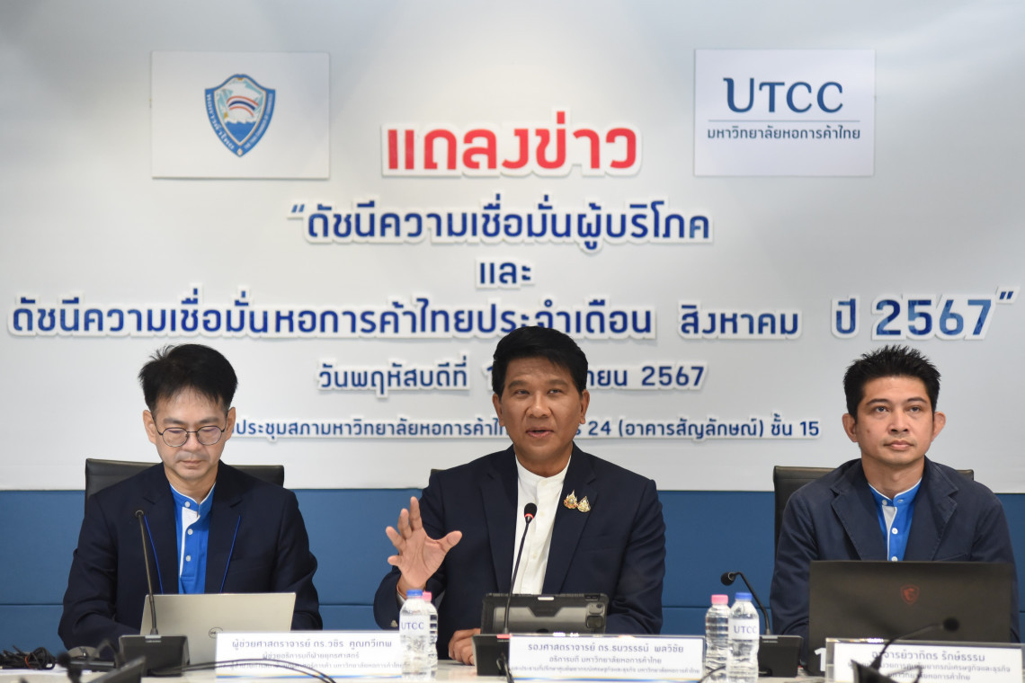 เมื่อวันที่ 12 ก.ย.67 นายธนวรรธน์ พลวิชัย อธิการบดีมหาวิทยาลัยหอการค้าไทย และประธานที่ปรึกษาศูนย์พยากรณ์เศรษฐกิจและธุรกิจ แถลงข่าวดัชนีความเชื่อมั่นผู้บริโภค และดัชนีความเชื่อมั่นหอการค้าไทย เดือนส.ค.67 ว่า จากผลของการสำรวจความเชื่อมั่นของผู้บริโภคในเดือนสิงหาคม 2567 ดัชนีความเชื่อมั่นของผู้บริโภคปรับตัวลดลงต่อเนื่องเป็นเดือนที่ 6 และอยู่ในระดับต่ำสุดในรอบ 13 เดือนนับตั้งแต่เดือนสิงหาคม 2566 เป็นต้นมา เนื่องจากผู้บริโภคมีความกังวลเกี่ยวกับภาวะเศรษฐกิจไทยที่ยังคงชะลอตัวลงและฟื้นตัวช้า เพราะยังไม่เห็นมาตรการกระตุ้นเศรษฐกิจที่ชัดเจนของรัฐบาลใหม่ ประกอบกับราคาพลังงานปรับตัวสูงขึ้น และผู้บริโภคยังคงกังวลเกี่ยวกับสถานการณ์เศรษฐกิจโลกชะลอตัว สงครามในตะวันออกกลางและสงครามระหว่างรัสเซียกับยูเครนที่ยังคงยืดเยื้ออาจเป็นปัจจัยที่เพิ่มแรงกดดันของการฟื้นตัวล่าช้าของเศรษฐกิจไทย