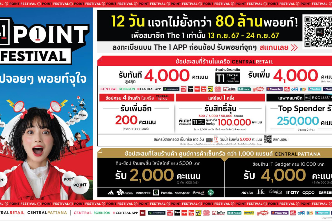 The 1 จัดแคมเปญ 'The 1 Point Festival' เทศกาลแจกพอยท์ครั้งใหญ่ที่สุดแห่งปี จับมือทั้งกลุ่มเซ็นทรัลและพันธมิตรหลักคนสำคัญบัตรเครดิต เซ็นทรัล เดอะวัน ร่วมสร้างปรากฏการณ์แจกถล่มทลายกว่า 80 ล้านพอยท์ เพื่อสมาชิก The 1 โดยเฉพาะ รับคะแนนจุกๆ ทุกการช้อปในเครือเซ็นทรัล รีเทล สูงสุด 4,000 คะแนน และรับเพิ่มอีก 4,000 คะแนน เมื่อชำระผ่านบัตรเครดิต เซ็นทรัล เดอะวัน พร้อมรับพอยท์เพิ่มอีก 200 คะแนนเมื่อช้อปครบ 4 ร้านค้าในเครือเซ็นทรัล รีเทล และเฉพาะสมาชิก The 1 Exclusive ที่เป็น Top Spender รับเลย 250,000 คะแนน จำนวน 2 ท่าน อีกทั้งรับพอยท์แบบจุใจสูงสุด 4,000 คะแนนเมื่อไปช้อปในศูนย์การค้าเซ็นทรัล ณ แบรนด์ร่วมรายการกว่า 1,000 แบรนด์ พร้อมสิทธิ์ลุ้นรับรางวัลใหญ่รวมมูลค่าสูงสุดถึง 2 ล้านคะแนน ยิ่งช้อป ยิ่งคุ้ม รีบลงทะเบียนด่วน! บน The 1 APP ก่อนช้อป 13 – 24 ก.ย. นี้!