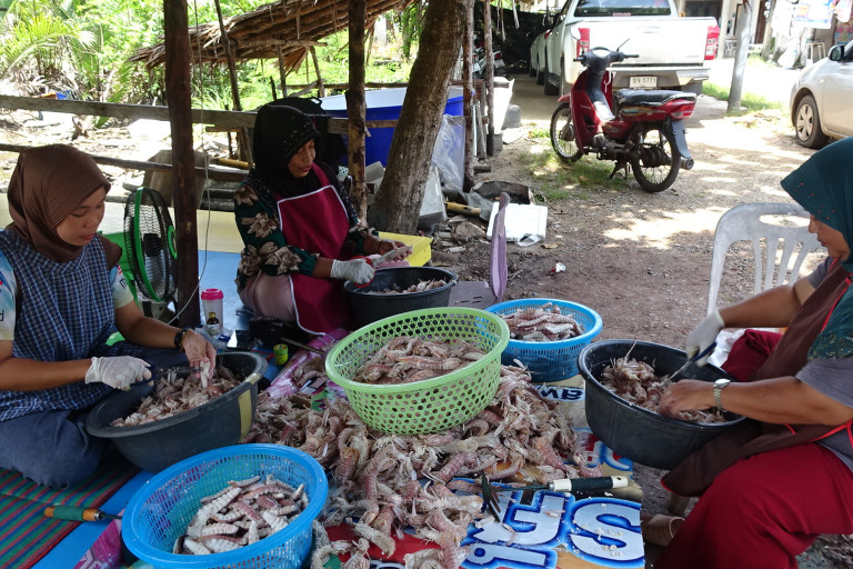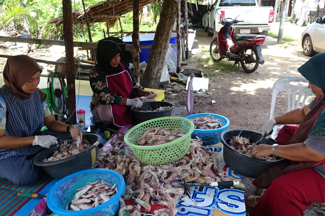 ด้าน นางสาวนูรชีรา อามาตี อายุ 24 ปี แรงงานแกะกั้ง บอกว่า พวกเรามีงานทำ ไม่ต้องออกไปหางานนอกหมู่บ้าน ได้ค่าแรงวันละ 400 บาท ทำงานตั้งแต่ 10 โมงเช้าถึงบ่าย 2 วันไหนเรือออกก็จะมีงานทำอาชีพนี้จะขึ้นอยู่กับสภาพอากาศ วิธีแกะกั้งขาวหรือกั้งแก้ว ใช้กรรไกรตัดหัวก่อนจากนั้นตัดหาง และครีมด้านข้างเพื่อให้แกะกระดองได้ง่าย ก็จะได้เนื้อกั้งเป็นชิ้นทั้งตัวพร้อมขายและนำไปปรุงได้อย่างสะดวกสบาย สำหรับกั้ง สามารถนำมาปรุงได้หลากหลายเมนูเช่นเดียวกับกุ้ง เช่น กั้งต้มน้ำจิ้มซีฟู้ด , กั้งทอดกระเทียมพริกไท ,ผัดเผ็ดหรือต้มย้ำ นอกจากนี้กลุ่มแม่บ้านยังนำมาแปรรูปเป็นผลิตภัณฑ์ของดีจากชุมชน น้ำพริกกั้ง ,มันกั้ง (คล้ายกับมันกุ้ง)