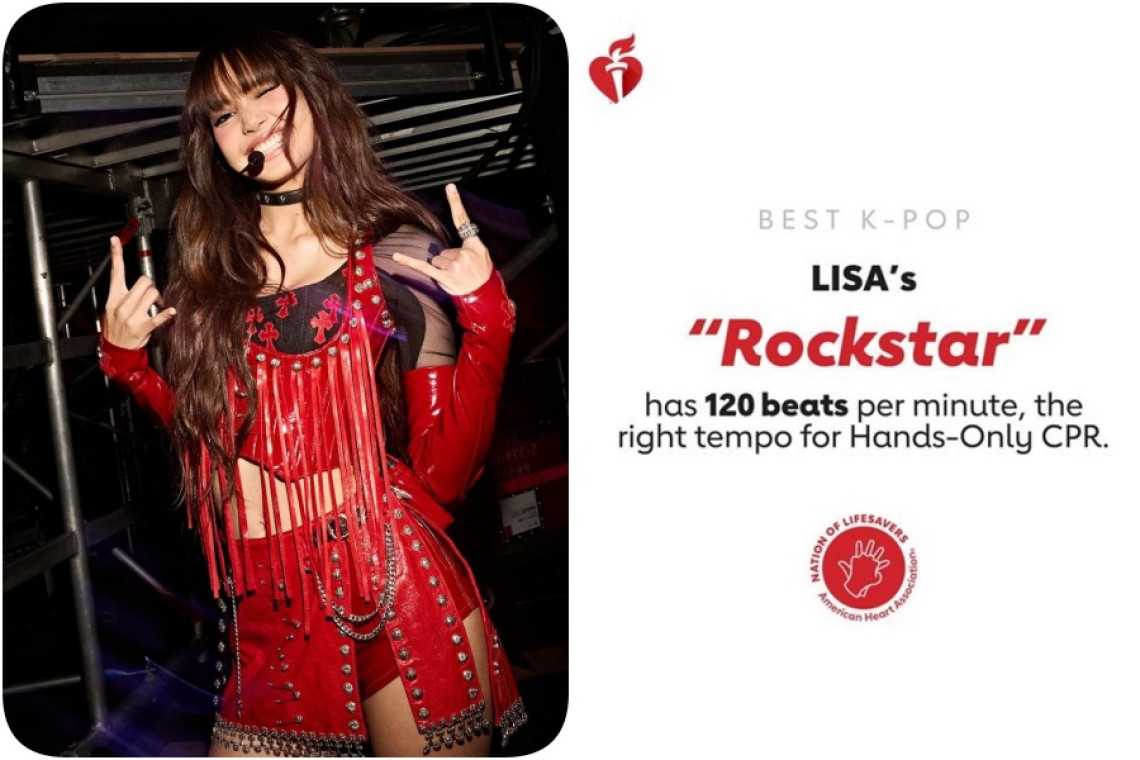 ล่าสุด วันนี้ (14 ก.ย.67) เพจเฟซบุ๊กสมาคมแพทย์โรคหัวใจอเมริกา (American Heart Association) เผยว่า เพลง Rockstar ของลิซ่าสามารถช่วยการทำ CPR ได้อย่างดี เพราะมีจังหวะ 120 BPM ต่อ 1 นาที ซึ่งเหมาะสมในการช่วยกะจังหวะปั๊มหัวใจแบบพอดี