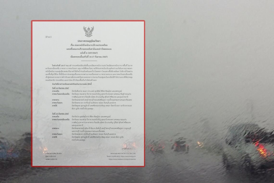 เมื่อวันที่ 14 ก.ย.67 เวลา 17.00 น. กรมอุตุนิยมวิทยา ออกประกาศเรื่อง "ฝนตกหนักถึงหนักมากบริเวณประเทศไทยและคลื่นลมแรงบริเวณทะเลอันดามันและอ่าวไทยตอนบน" ฉบับที่ 6 โดยระบุว่า...