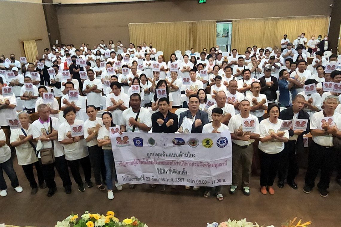 นายพงศธรรศ รุจิพุฒธันยพัต นายกสมาคมนักข่าวปทุมธานี กล่าวว่า ผมในฐานะเป็นประธานอำนวยการลูกปทุมต้นแบบต้านโกง เราได้ก่อตั้งลูกปทุมต้นแบบต้านโกงมาตั้งแต่ปี พ.ศ.2561 พานักเรียนในจังหวัดปทุมธานี จำนวน 3,500 คน จำนวน 22 โรงเรียน ไปดูเกี่ยวกับการต้านโกง การต้านทุจริตต่างๆ ที่พิพิธภัณฑ์ต้านโกง ป.ป.ช. กรุงเทพมหานคร ซึ่งในปัจจุบันนี้เด็กที่อยู่ในโครงการนี้ได้เติบโตจนสามารถใช้สิทธิเลือกตั้งได้ การเลือกตั้งที่ผ่านมาเด็กของเราก็ไปใช้สิทธิตามกฎหมาย นอกจากนี้เด็กๆยังมีการส่งข้อมูลเกี่ยวกับการกระทำผิดกฎหมายเลือกตั้ง เช่น การซื้อเสียง วันนี้เราได้ตั้งเงินรางวัลจำนวน 300,000 บาท หากใครก็ตามสามารถมีหลักฐานการกระทำผิดกฎเลือกตั้งถ่ายภาพ ถ่ายคลิปวีดีโอ การซื้อสิทธิขายเสียง ส่งมาที่ คุณชณัฐ รานุรักษ์ เลขาธิการคณะกรรมการลูกปทุมต้นแบบต้านโกง เบอร์ 095-461-9551 ขอให้เชื่อว่าเราจะเก็บข้อมูลไว้เป็นความลับ เมื่อเราได้หลักฐานข้อมูลทั้งหมดสรุปให้ทางเจ้าหน้าที่ กกต. ซึ่งข้อมูลที่ได้มาดำเนินการจนกระบวนการเสร็จสิ้น ผู้กระทำผิดถูกศาลตัดสินลงโทษหรือทาง กกต. วินิจฉัยจนถูกใบเหลืองใบแดงหรือใบดำ ท่านจะได้รับเงินรางวัล 300,000 บาทไป วันนี้เรามาต่อต้านคอร์รัปชัน ต่อต้านการโกง ปทุมธานีจะต้องเป็นจังหวัดนำร่อง การเมืองต้องใสบริสุทธิ์ไม่มีการซื้อเสียง