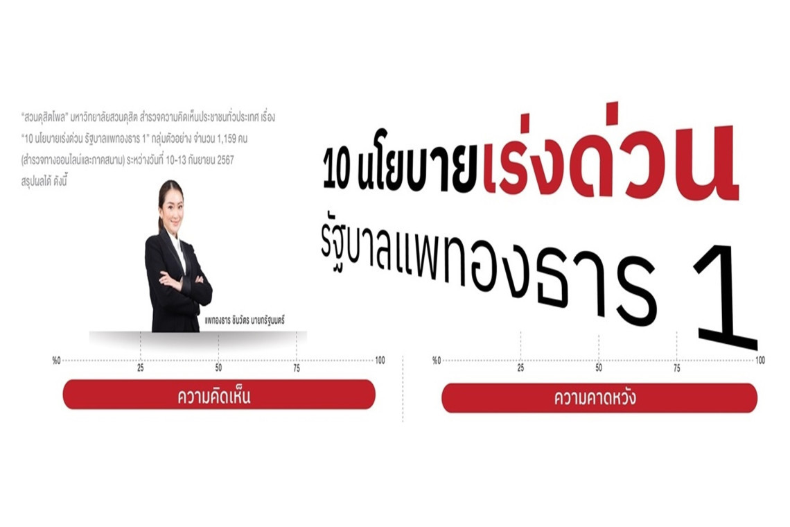 เมื่อวันที่ 15 ก.ย.67 สวนดุสิตโพล มหาวิทยาลัยสวนดุสิต สำรวจความคิดเห็นประชาชนทั่วประเทศ เรื่อง 10 นโยบายเร่งด่วน รัฐบาล แพทองธาร 1 ระหว่างวันที่ 10-13 ก.ย.67 กลุ่มตัวอย่าง จำนวน 1,159 คน สำรวจผ่านทางออนไลน์และภาคสนาม พบว่า จาก 10 นโยบายเร่งด่วนของรัฐบาล กลุ่มตัวอย่างเห็นด้วยกับทุกนโยบาย โดยเห็นด้วยกับนโยบายส่งเสริมการท่องเที่ยวมากที่สุด ร้อยละ 97.15 โดยคิดว่าเป็นนโยบายที่คาดว่าน่าจะทำได้สำเร็จ ร้อยละ 74.46 อีกนโยบายที่คาดว่าน่าจะทำได้สำเร็จ คือ นโยบายออกมาตรการลดราคาค่าพลังงานและสาธารณูปโภค ร้อยละ 65.40 นอกจากนี้กลุ่มตัวอย่างมองว่านโยบายแก้ปัญหายาเสพติดและอาชญากรรมออนไลน์นั้นน่าจะเป็นเรื่องที่ไม่น่าจะทำได้สำเร็จ ร้อยละ 33.05 และร้อยละ 31.06 ตามลำดับ นอกจาก 10 นโยบายแล้วก็อยากให้เร่งแก้ปัญหาน้ำท่วม ช่วยเหลือผู้ที่เดือดร้อนโดยเร็ว ร้อยละ 67.46