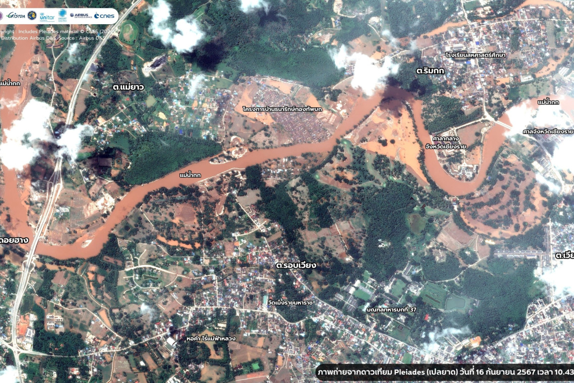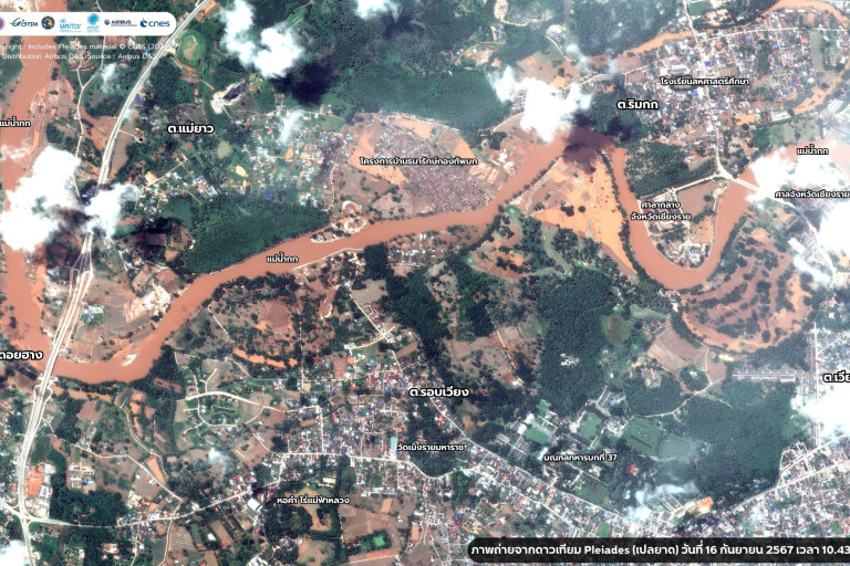 GISTDA เผยภาพล่าสุดจากดาวเทียม Pléiades (เปลยาด) ของวันที่ 16 กันยายน 2567 เมื่อเวลา 10.43 น. (ได้รับการสนับสนุนภาพถ่ายจากดาวเทียมภายใต้ International charter space and major disasters (The Charter)) ในพื้นที่บางส่วนของตำบลดอยฮาง ตำบลรอบเวียง ตำบลแม่ยาว ตำบลริมกก และตำบลเวียง อำเภอเมืองเชียงราย จังหวัดเชียงราย ซึ่งหลายพื้นที่เริ่มคลี่คลาย ในขณะที่บางพื้นที่ยังคงมีน้ำท่วมขังโดยเฉพาะพื้นที่เกษตรกรรมและชุมชนที่อยู่อาศัยริมแม่น้ำกก ทั้งนี้ มวลน้ำเหล่านี้จะไหลลงสู่แม่น้ำโขงต่อไป