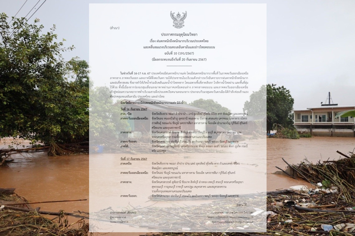 เมื่อเวลา 17.00 น. วันที่ 16 ก.ย.2567 กรมอุตุนิยมวิทยา ประกาศกรมอุตุนิยมวิทยา เรื่อง ฝนตกหนักถึงหนักมากบริเวณประเทศไทย และคลื่นลมแรงบริเวณทะเลอันดามันและอ่าวไทยตอนบน ฉบับที่ 10 (191/2567) (มีผลกระทบตั้งแต่วันที่ 16-17 กันยายน 2567)