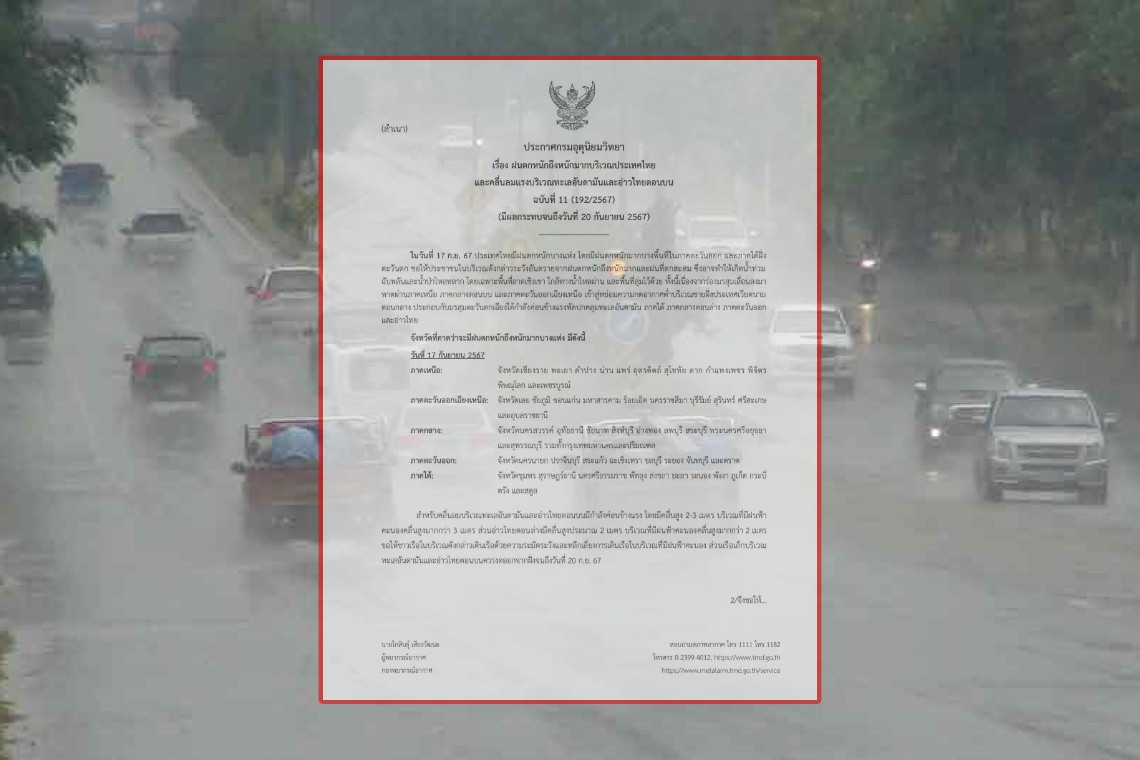 วันที่ 17 ก.ย.67 กรมอุตุนิยมวิทยา ประกาศ เรื่อง ฝนตกหนักถึงหนักมากบริเวณประเทศไทย และคลื่นลมแรงบริเวณทะเลอันดามันและอ่าวไทยตอนบน ฉบับที่ 11 (192/2567) (มีผลกระทบจนถึงวันที่ 20 กันยายน 2567) ระบุว่า