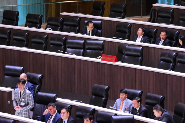 วันที่ 18 ก.ย.2567 เวลา 09.30 น.ที่รัฐสภา ผู้สื่อข่าวรายงานว่า มีการประชุมสภาผู้แทนราษฎร ที่มีนายพิเชษฐ์ เชื้อเมืองพาน รองประธานสภาผู้แทนราษฎร ทำหน้าที่ประธานการประชุม ทั้งนี้เจ้าหน้าที่สำนักการประชุม สภาผู้แทนราษฎร ได้นำป้ายชื่อพรรคพลังประชารัฐ ไปวางอยู่ด้านหลังพรรคประชาชน ในโซนที่นั่งของพรรคฝ่ายค้านแล้ว จากเดิมก่อนหน้านี้ป้ายพรรคประชารัฐจะอยู่ด้านหน้าบัลลังก์ฝั่งพรรครัฐบาล โดยพื้นที่เดิมของพรรคพลังประชารัฐ เจ้าหน้าที่นำป้ายชื่อพรรคภูมิใจไทยขยับมาแทนที่