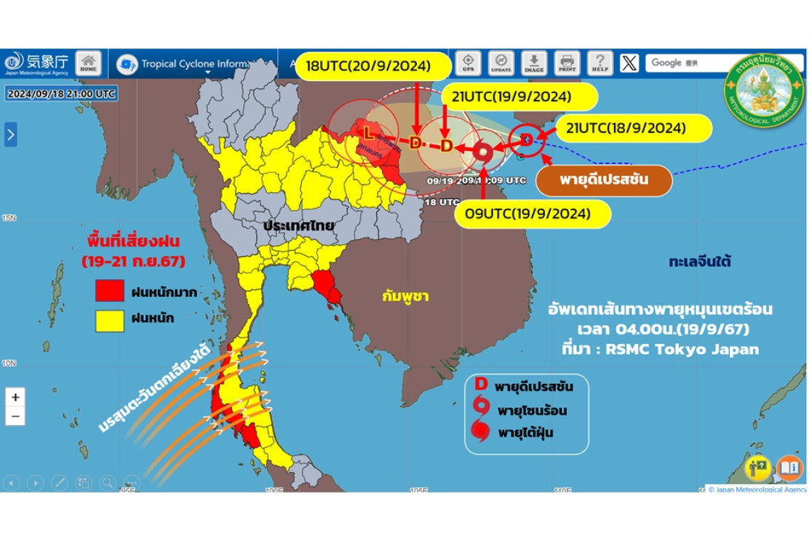 ส่วนมรสุมตะวันตกเฉียงใต้ (ลมฝน)มีกำลังแรงพัดเข้าหาพายุดีเปรสชันและหย่อมความกดอากาศต่ำ ทำให้ภาคกลางตอนล่าง กรุงเทพมหานครและปริมณฑล ภาคตะวันออก (นครนายก ระยอง ชลบุรี จันทบุรี ตราด ) และภาคใต้ โดยเฉพาะฝั่งอันดามัน (ระนอง พังงา ภูเก็ต กระบี่ ตรัง สตูล)มีฝนตกหนักมากบางแห่ง คลื่นลมมีกำลังแรงลม ในช่วงวันที่ 20–23 ก.ย. 67 ยังต้องติดตามและเฝ้าระวังเป็นพิเศษ