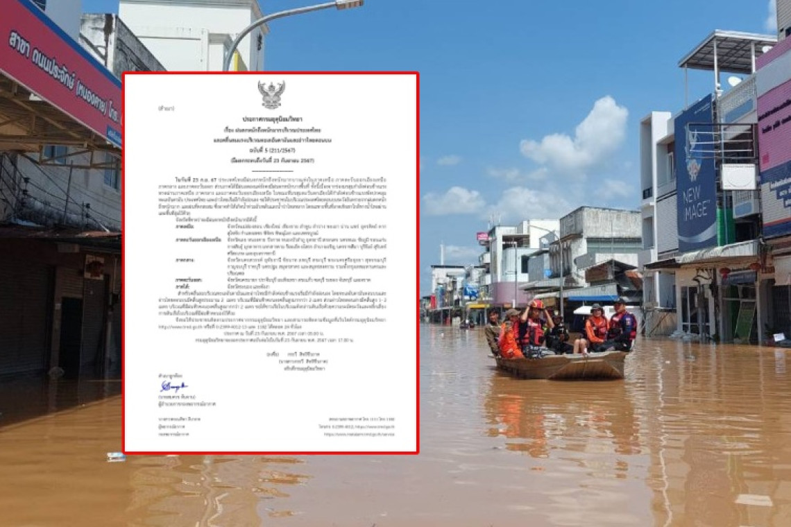 เมื่อวันที่ 23 ก.ย.67 นางสาวกรรวี สิทธิชีวภาค อธิบดีกรมอุตุนิยมวิทยา ออกประกาศกรมอุตุนิยมวิทยา เรื่อง “ฝนตกหนักถึงหนักมากบริเวณประเทศไทย และคลื่นลมแรงบริเวณทะเลอันดามันและอ่าวไทยตอนบน” ฉบับที่ 5 (มีผลกระทบถึงวันที่ 23 กันยายน 2567) โดยมีใจความว่า