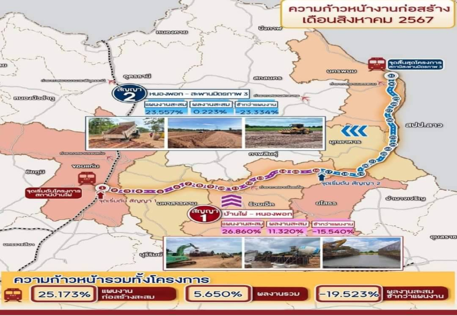 และปัจจุบันในส่วนที่ผ่านจังหวัดยโสธรได้เริ่มดำเนินการก่อสร้างแล้ว โดยได้ส่งมอบพื้นที่เวนคืนแล้วประมาณ 75% ดำเนินงานวางศิลาฤกษ์ สถานีรถไฟเลิงนกทา (21 กันยายน 2566) งานกรุยทาง ถางป่า แนวเส้นทางรถไฟ งานก่อสร้างถนนลำเลียงวัสดุ ตามแนวเส้นทางรถไฟ และเตรียมงานเสาเข็มเจาะสะพานรถไฟ อำเภอเลิงนกทาแล้ว คาดว่าจะสามารถเปิดใช้งานได้ในปี 2570