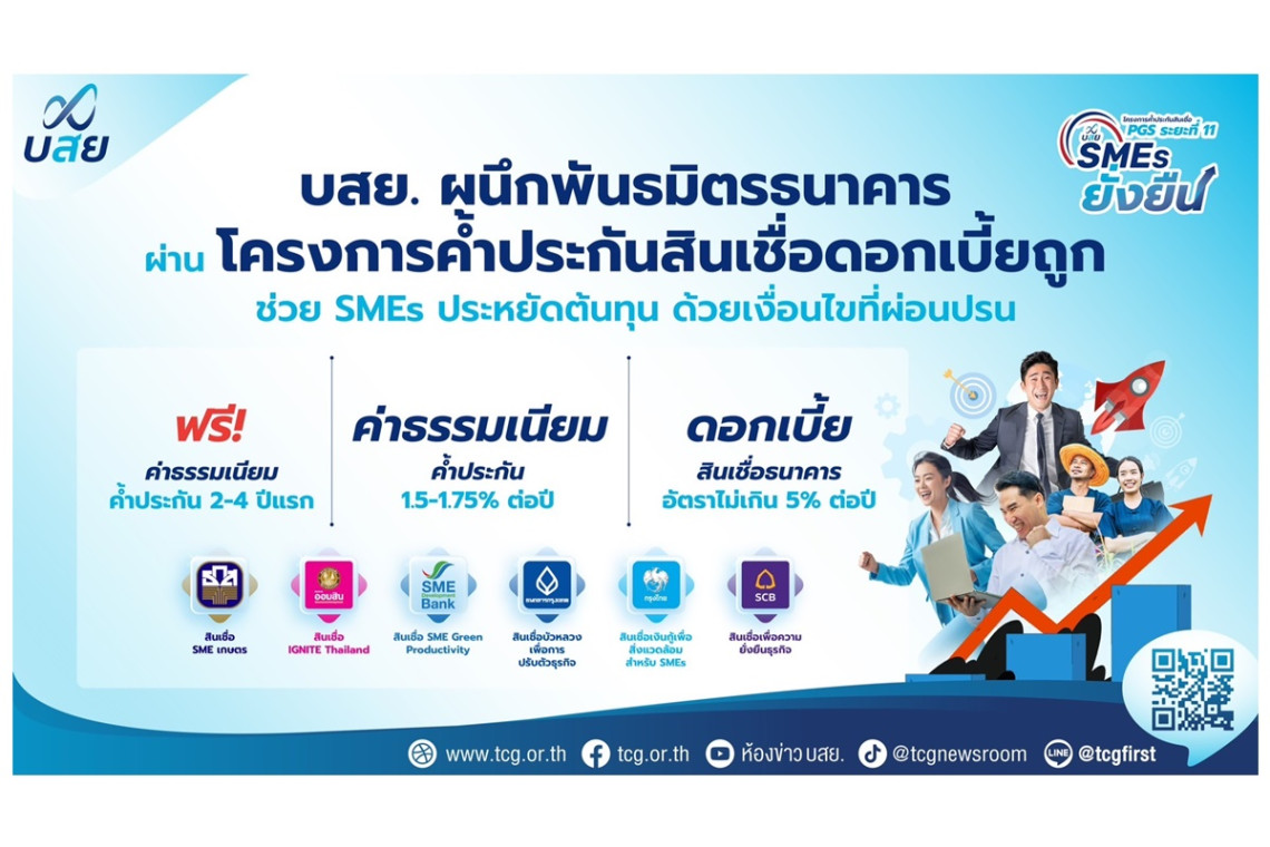 บสย.ผนึกพันธมิตรสถาบันการเงิน ทั้งแบงก์รัฐ-เอกชน จัดโครงการค้ำประกันสินเชื่อดอกเบี้ยถูก ฟรีค่าธรรมเนียม 2-4 ปีแรก ช่วย SMEs ประหยัดต้นทุน ลดภาระทางการเงิน เพิ่มโอกาสเข้าถึงสินเชื่อได้ง่ายขึ้น ช่วยเติมสภาพคล่อง และพลิกฟื้นธุรกิจให้ SMEs