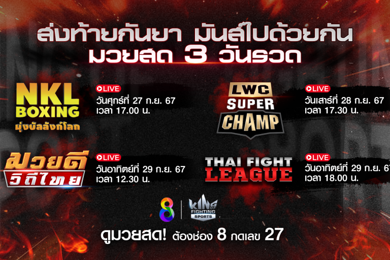 ดังนั้นอย่าลืมพลาดชมความสนุกกับ 4 รายการมวยไทยสุดสัปดาห์ที่มันที่สุดในประเทศ เพื่อแฟนกีฬาเลือดนักสู้โดยเฉพาะในรายการ NKL BOXING มุ่งบัลลังก์โลก ในวันศุกร์ที่ 27 กันยายน เวลา 17.00 น. ถ่ายทอดสดจาก เวทีมวยชั่วคราว เดอะบาซ่าร์ รัชดาภิเษก ต่อด้วย รายการ LWC SUPER CHAMP ลุมพินีเวิลด์ แชมเปี้ยนชิพ ซุปเปอร์แชมป์ ในวันเสาร์ที่ 28 กันยายน เวลา 17.30 น. ถ่ายทอดสดจาก ลุมพินี มวยไทย อารีน่า (LUMPINEE MUAYTHAI ARENA) ปิดท้าย 2 รายการส่งท้ายสุดสัปดาห์ในวันอาทิตย์ที่ 29 กันยายน กับรายการ มวยดีวิถีไทย เวลา 12.30 น. ถ่ายทอดสดจาก เวทีมวยกองทัพอากาศ (ธูปะเตมีย์) และ รายการ THAI FIGHT LEAGUE เวลา 18.00 น.ถ่ายทอดสดจาก BEAT Active ไบเทค บุรี ทางช่อง 8 กดเลข 27 เท่านั้น ที่มีรายการมวยไทยมากที่สุด!