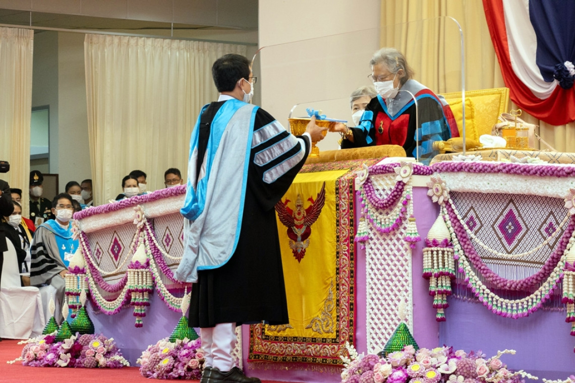 สำหรับพระแท่นที่ประทับพระราชทานปริญญาบัตร และบริเวณเวทีในปีการศึกษานี้ได้นำเสนอเรื่องราว “นวัตกรรมสังคม” ที่ได้รวมศาสตร์ศิลป์ “โนรา” และ “การแทงหยวก” มรดกภูมิปัญญา ศิลปวัฒนธรรมล้ำค่าของชาวใต้ ประกอบด้วย ลวดลายการแทงหยวก เทริด เครื่องแต่งกายโนรา ลูกปัดโนรา และดอกไม้พื้นถิ่นใต้