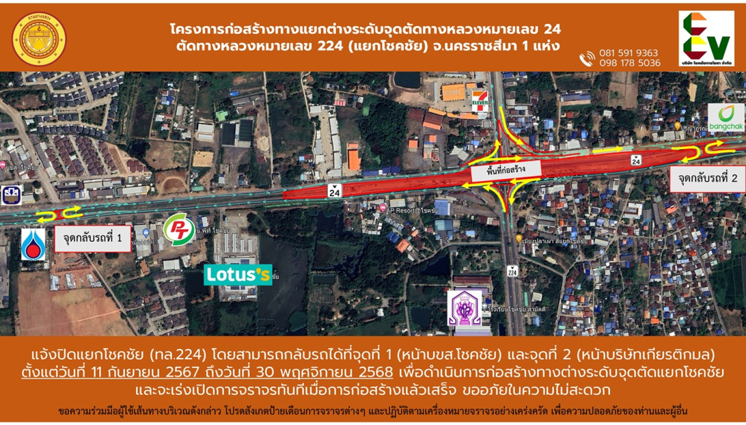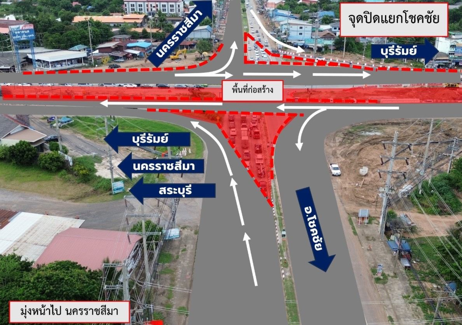 ล่าสุด นายทวีศักดิ์  ศักดิ์ศินานนท์ นายช่างโครงการ ฯ พร้อมคนงานได้ปิดทางแยกโชคชัย เพื่อก่อสร้างโครงสร้างสะพานยกระดับข้ามแยก กำหนดถึงวันที่ 30 พฤศจิกายน 68 โดยประชาสัมพันธ์ให้ผู้เดินทางใช้จุดกลับรถชั่วคราว 1.จาก จ.บุรีรัมย์ ตาม ทล. 24 เดินทางไปตัวเมืองนครราชสีมา ใช้จุดกลับรถหน้าสถานีขนส่งโชคชัย (จุดกลับรถที่ 1) 2. จากตัว อ.โชคชัย ตาม ทล.224 เดินทางไปตัวเมืองนครราชสีมาและ จ.บุรีรัมย์ ใช้จุดกลับรถที่ 1 ส่วน 3. จากสระบุรีตาม ทล.24 ไป อ.โชคชัย อ.ครบุรี และ อ.เสิงสาง ใช้จุดกลับรถชั่วคราวบริเวณหน้าร้านเกียรติกมล (จุดกลับรถที่ 2) 4. จากนครราชสีมา ตาม ทล.224 เดินทางไป อ.โชคชัย อ.ครบุรี อ.เสิงสาง และ จ.สระบุรี ใช้จุดกลับรถที่ 2