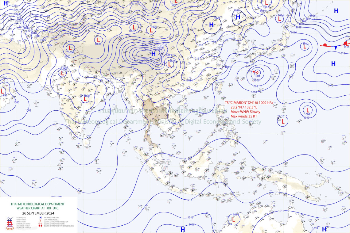 จากการติดตามและคาดการณ์ของกรมอุตุนิยมวิทยา ในขณะนี้มีพายุในมหาสมุทรแปซิฟิกอยู่ 1 ลูก เป็นพายุหมุนเขตร้อนมีความรุนแรงอยู่ในระดับ พายุโซนร้อน ชื่อ "ซีมารอน" (CIMARON) คาดว่าจะเคลื่อนขึ้นไปทางตอนใต้ของประเทศญี่ปุ่นและจะอ่อนกำลังลงตามลำดับต่อไป และจะมีการก่อตัวของความกดอากาศต่ำที่ก่อตัวขึ้นมาใหม่บริเวณด้านตะวันออกของประเทศฟิลิปปินส์ มีแนวโน้มจะมีกำลังแรงขึ้นเป็นพายุหมุนเขตร้อน คาดว่าจะมีกำลังแรงขึ้นเป็นพายุไต้ฝุ่นและจะเคลื่อนตัวไปทางเกาะไต้หวัน