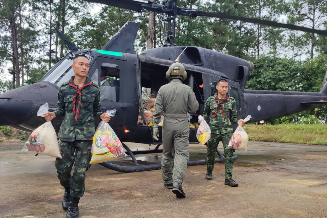ทบ.ส่งกำลังสนับสนุนทางอากาศ ลำเลียงถุงยังชีพช่วยเหลือผู้ประสบอุทกภัยที่ถูกตัดขาดใน อ.เวียงป่าเป้า จ.เชียงราย