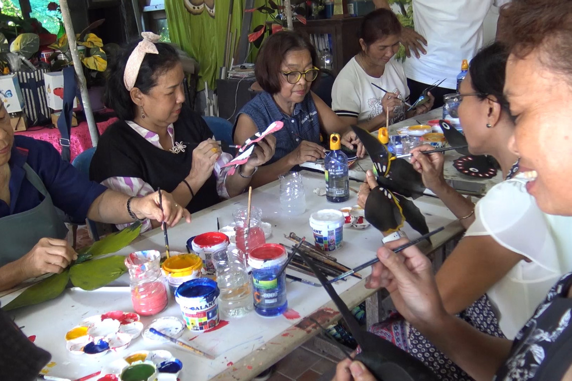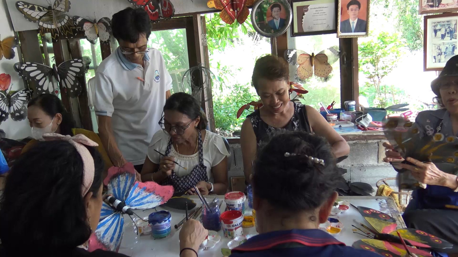 กลุ่มสตรีผู้สูงอายุจากศูนย์บริบาลผู้สูงอายุของ อบจ.สงขลา เรียนรู้การทำผีเสื้อและบอนสี โดยใช้เวลาว่างให้เป็นประโยชน์หลัง เกษียณอายุราชการมาแล้ว ได้มีงานทำ นำมาเป็นอาชีพ สร้างรายได้ให้กับตนเองและครอบครัว