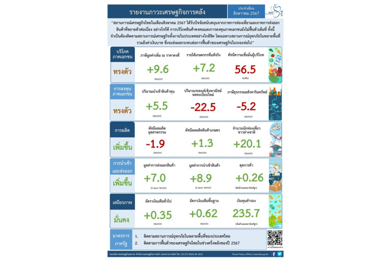 เมื่อวันที่ 27 กันยายน 2567 นายพรชัย ฐีระเวช ผู้อำนวยการสำนักงานเศรษฐกิจการคลัง เปิดเผยภาวะเศรษฐกิจการคลังประจำเดือนสิงหาคม2567 ว่า “สถานการณ์เศรษฐกิจไทยในเดือนสิงหาคม 2567 ได้รับปัจจัยสนับสนุนจากภาคการท่องเที่ยวและภาคการส่งออกสินค้าที่ขยายตัวต่อเนื่อง อย่างไรก็ดี การบริโภคสินค้าคงทนและการลงทุนภาคเอกชนยังไม่ฟื้นตัวเต็มที่ ทั้งนี้ จำเป็นต้องติดตามสถานการณ์เศรษฐกิจทั้งภายในประเทศอย่างใกล้ชิด โดยเฉพาะสถานการณ์อุทกภัยในหลายพื้นที่ รวมถึงค่าเงินบาท ซึ่งจะส่งผลกระทบต่อการฟื้นตัวของเศรษฐกิจในระยะต่อไป” โดยมีรายละเอียดสรุปได้ ดังนี้