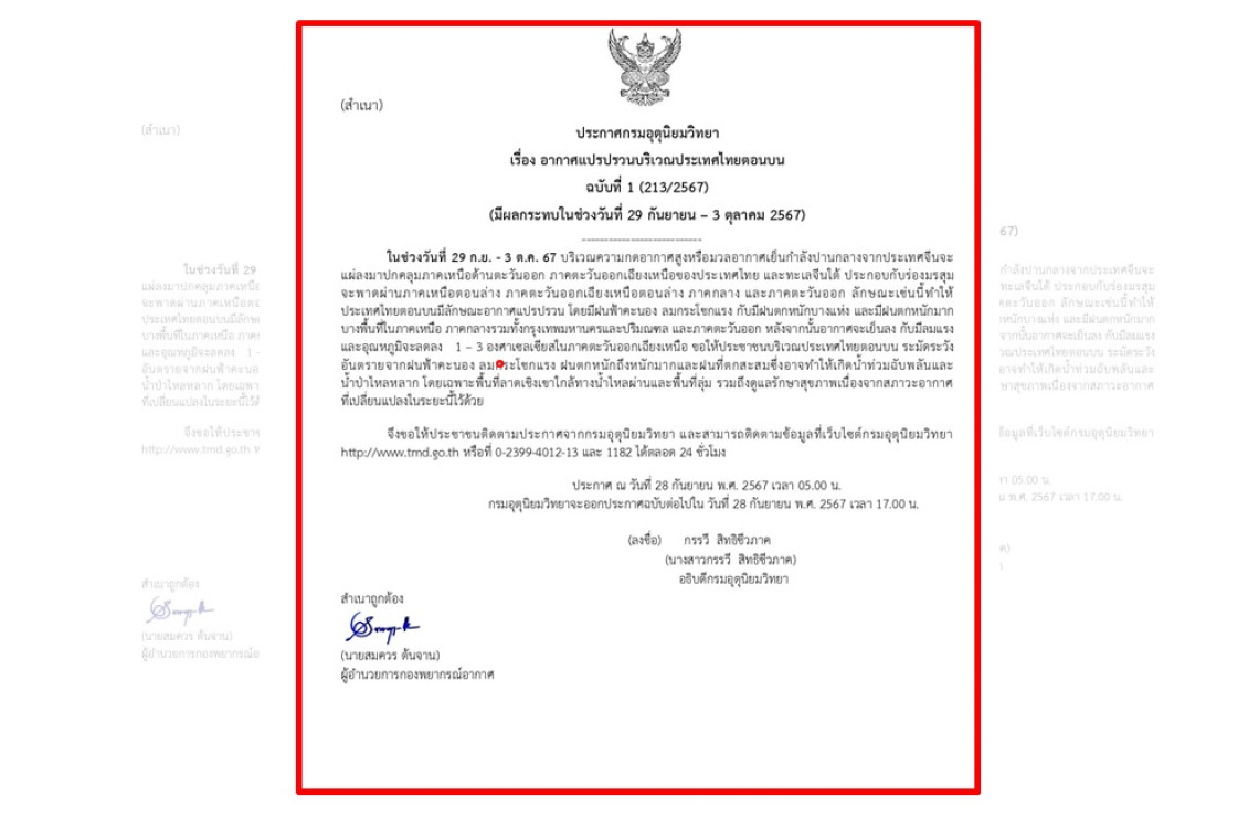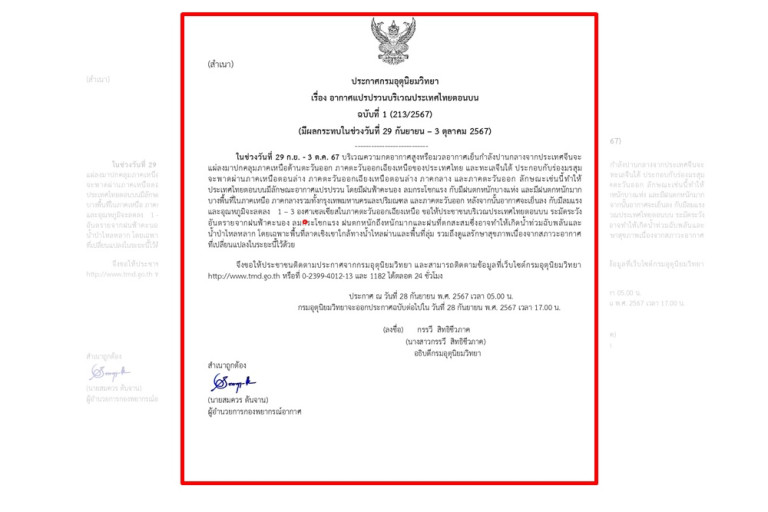 เมื่อวันที่ 28 ก.ย.67 นางสาวกรรวี สิทธิชีวภาค อธิบดีกรมอุตุนิยมวิทยา ออกประกาศกรมอุตุนิยมวิทยาเรื่อง อากาศแปรปรวนบริเวณประเทศไทยตอนบน ฉบับที่ 1 (213/2567) (มีผลกระทบในช่วงวันที่ 29 กันยายน – 3 ตุลาคม 2567)