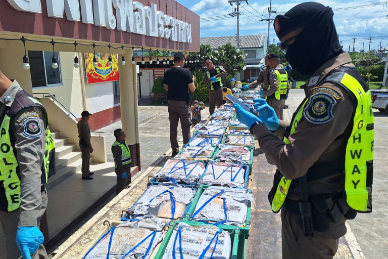 เมื่อเวลาประมาณ 15.00 น. วันที่ 30 กันยายน 67 ผู้สื่อข่าวรายงานว่า ที่สถานีตำรวจทางหลวงประจวบคีรีขันธ์ 3 กองกำกับการ 2 กองบังคับการตำรวจทางหลวง พ.ต.ต.พุทธางกูร เรืองธรรม สารวัตรสถานีตำรวจทางหลวงประจวบฯ พร้อมด้วย พ.ต.อ.สมมาตร สังข์ทอง ผกก.สอบสวนภูธรจังหวัดประจวบคีรีขันธ์ พ.ต.อ.หญิง กมลทิพย์ สุทธิมรรคผล ผกก.พฐ.ประจวบฯ ร.ต.อ.เวิน ไชยอาษา รองสารวัตรตำรวจทางหลวงประจวบ 3 นำกำลังเจ้าหน้าที่ตำรวจ ร่วมกัน ตรวจยึดและทำบันทึกจับกุมของกลางเป็นยาบ้ากว่า 10 ล้านเม็ด ซึ่งบรรจุอยู่ในตะกร้าผักผลไม้คลุมมด้วยผ้าใบสีดำ จำนวน 65 ตะกร้า บนท้ายรถบรรทุกพ่วงเทรลเลอร์ 22 ล้อยี่ห้อ Hino 500 สีขาว หมายเลขทะเบียน ส่วนหัว 71-xxxx สงขลา หมายเลขตัวพ่วง 71-xxxx สงขลา โดยมีผู้ต้องหาจำนวน 2 ราย ประกอบด้วย นายอมร (สงวนนามสกุล) อายุ 51 ปี ชาวจังหวัดสตูล และนายวีระพงษ์ (สงวนนามสกุล) อายุ 39 ปี ชาวจังหวัดตรัง ก่อนจะนำตัวผู้ต้องหาพร้อมของกลางทั้งหมด ส่ง เจ้าหน้าที่ปปส.ภาค 7 ดำเนินการต่อไป