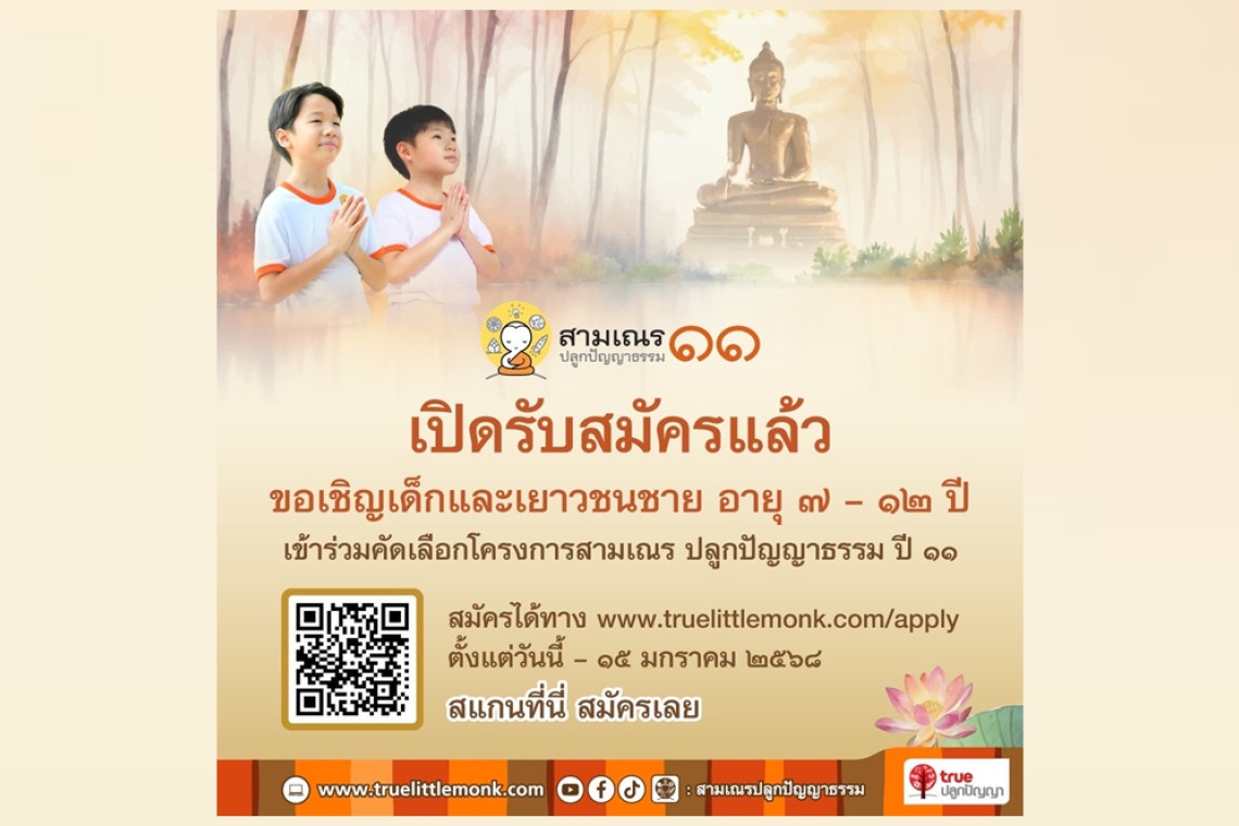 ทรูปลูกปัญญา เตรียมสัญจรสู่ประตูเมืองภาคอีสาน สถานปฏิบัติธรรมธวีธรรม อำเภอปากช่อง อีกครั้ง…เครือเจริญโภคภัณฑ์ และทรู คอร์ปอเรชั่น เชิญชวนเด็กและเยาวชนชายใฝ่ธรรมะ อายุระหว่าง 7-12 ปี ทั้ง 77 จังหวัด ทั่วประเทศ ที่สนใจใช้เวลาช่วงปิดเทอมภาคฤดูร้อนอย่างมีคุณค่า ก้าวสู่เส้นทางพุทธบุตรครั้งหนึ่งในชีวิต ศึกษาธรรมะตามหลักธรรมพระพุทธศาสนา เข้าร่วมสมัครในโครงการสามเณร ปลูกปัญญาธรรม ปี 11 เรียลลิตี้ธรรมะถ่ายทอดสดแห่งแรกในเมืองไทย ด้วยการส่งประวัติ แนะนำตัว บอกเล่าเรื่องราวที่น่าสนใจของตนเอง พร้อมวิดีโอหรือภาพถ่าย และเรียงความเรื่อง "เหตุผลที่อยากบรรพชากับโครงการสามเณร ปลูกปัญญาธรรม ปี 11" ตั้งแต่วันนี้ – 15 มกราคม 2568 ทาง www.truelittlemonk.com/apply เพื่อศึกษาและอบรมหลักธรรมคำสอนทางพระพุทธศาสนา