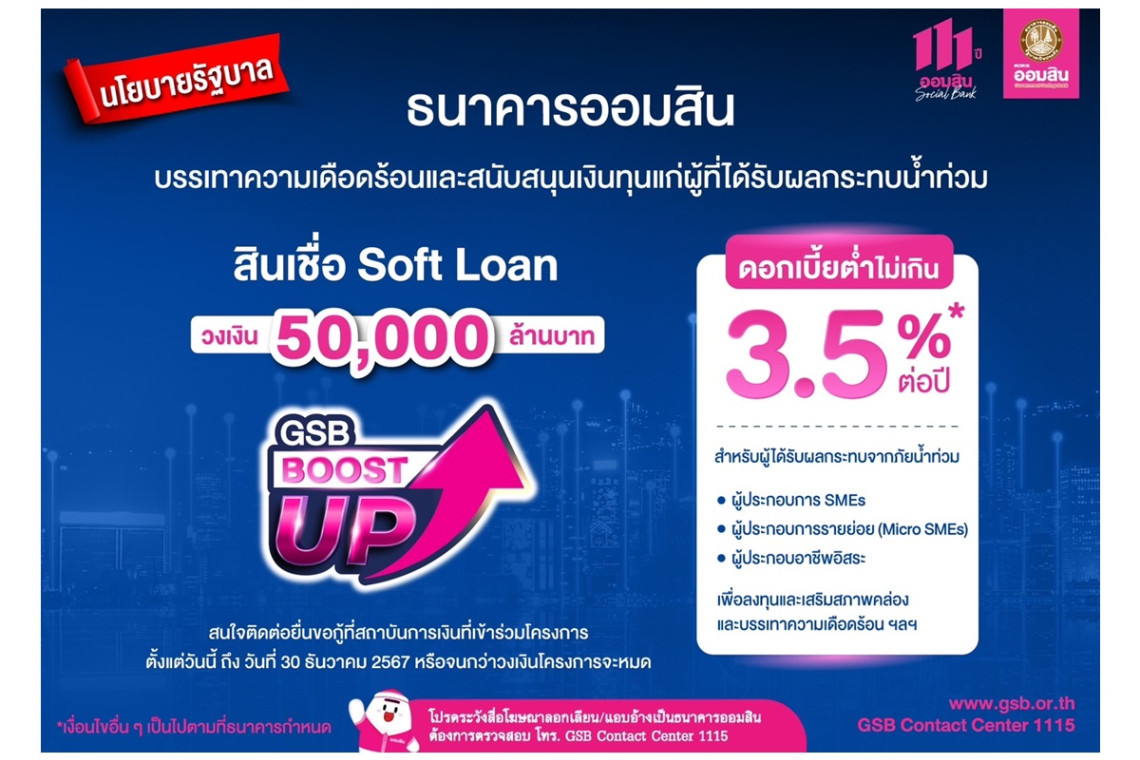 1.จัดสรรวงเงินจำนวน 50,000 ล้านบาท ภายใต้โครงการสินเชื่อดอกเบี้ยต่ำ (Soft Loan) GSB Boost Up เพื่อนำมาช่วยเหลือผู้ที่ได้รับผลกระทบจากสถานการณ์อุทกภัย โดยขยายกลุ่มเป้าหมายให้ครอบคลุมทั้งผู้ประกอบการ SMEs ผู้ประกอบการรายย่อย และผู้ประกอบอาชีพอิสระ โดยธนาคารออมสินสนับสนุนแหล่งเงินทุนดอกเบี้ยต่ำให้แก่สถาบันการเงินที่เข้าร่วมโครงการ ทั้งธนาคารพาณิชย์และสถาบันการเงินเฉพาะกิจในอัตราดอกเบี้ยร้อยละ 0.01 ต่อปี เป็นระยะเวลา 2 ปี เพื่อนำไปปล่อยสินเชื่อให้แก่ผู้ที่ได้ผลกระทบจากสถานการณ์อุทกภัยในอัตราดอกเบี้ยไม่เกินร้อยละ 3.5 ต่อปี เป็นระยะเวลา 2 ปี วงเงินต่อรายไม่เกิน 40 ล้านบาทรวมทุกสถาบันการเงิน และภายใต้วงเงินดังกล่าวธนาคารออมสินสามารถปล่อยสินเชื่อให้แก่ผู้ที่ได้ผลกระทบจากสถานการณ์อุทกภัยโดยตรงภายใต้หลักเกณฑ์และเงื่อนไขเดียวกัน ทั้งนี้ สามารถยื่นขอสินเชื่อได้จนถึงวันที่ 30 ธันวาคม 2567