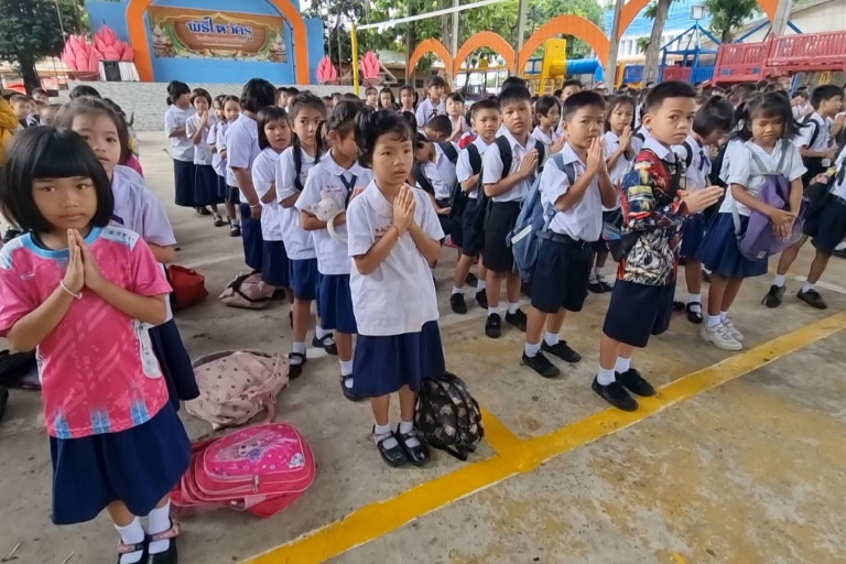 กลุ่มเด็กนักเรียนทุกระดับชั้น โรงเรียนพุทธเมตตาวิทยา วัดไชยมงคล จังหวัดอุบลราชธานี ร่วมกันแสดงความอาลัยต่อกลุ่มเพื่อนนักเรียนในวัยเดียวกัน พร้อมครู ที่เสียชีวิตจากเหตุการณ์รถบัสทัศนศึกษาเกิดไฟไหม้ครั้งวานนี้