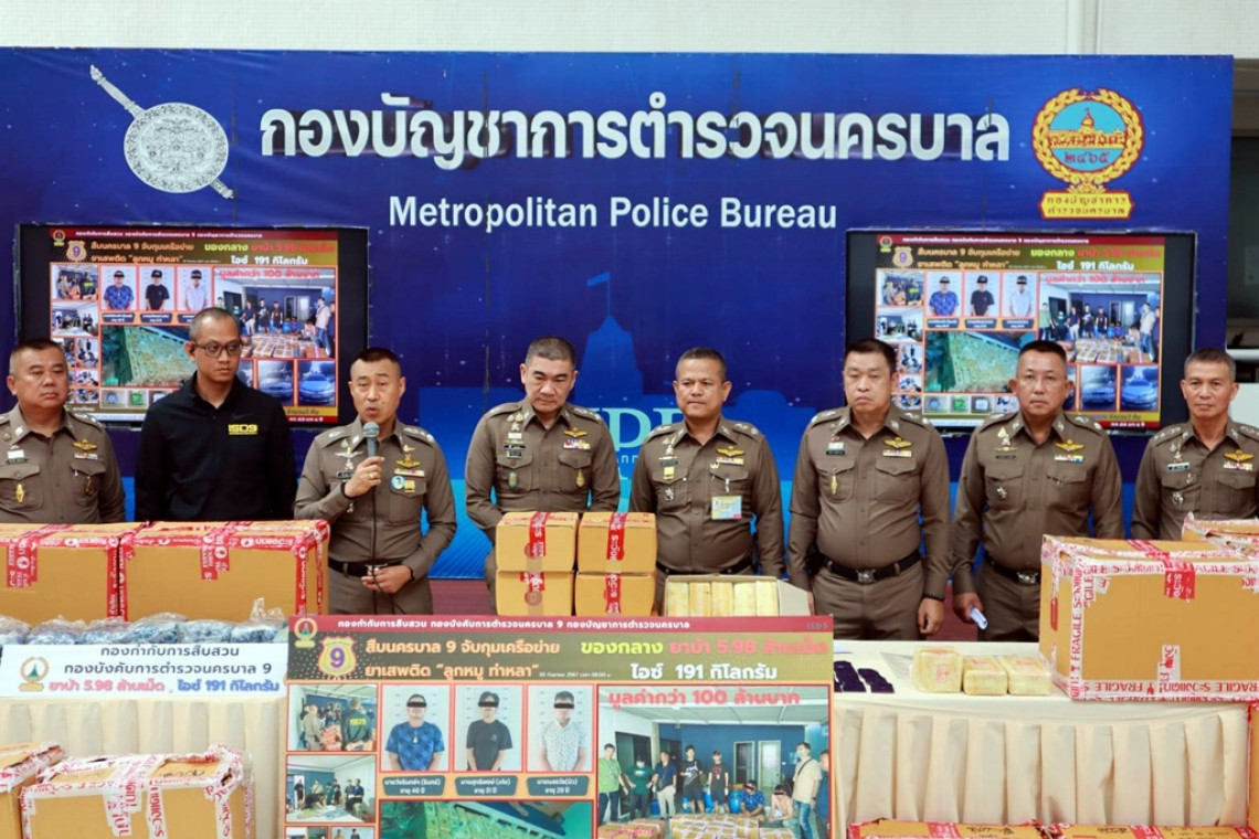 วันที่ 2 ต.ค.67 ที่ลานอเนกประสงค์ บช.น. พล.ต.ท.สำราญ นวลมา ผู้ช่วย ผบ.ตร. พร้อมด้วย พล.ต.ท.ธิติ แสงสว่าง ผบช.น., พล.ต.ต.วสันต์ เตชะอัครเกษม รอง ผบช.น., พล.ต.ต.ทินกร รังมาตย์ รอง ผบช.น., พล.ต.ต.ประสงค์ อานมณี ผบก.น.9, พ.ต.อ.เศกสิทธิ์ สุภาอ้วน รอง ผบก.น.9, พ.ต.อ.สุธี พรมมาลี รอง ผบก.น.9, พ.ต.อ.ธีระชัย เด็ดขาด รอง ผบก.น.9, พ.ต.อ.ศุภวัช ปานแดง รอง ผบก.น.9, พ.ต.อ.กิตติพงศ์ พันธ์ศรี รอง ผบก.น.9 และเจ้าหน้าที่ตำรวจ กองกำกับการสืบสวน กองบังคับการตำรวจนครบาล 9 แถลงข่าวจับกุมนายวัชรินทร์ (ขอสงวนนามสกุล) หรือบังริน, นายสุทธิพงษ์ (ขอสงวนนามสกุล) หรือเก่ง, นายนลธวัธ (ขอสงวนนามสกุล) หรือนิว ซุกซ่อนยาเสพติดภายในห้องพัก B8 ในรีสอร์ทแห่งหนึ่ง ซ.รามอินทรา 5 แขวงท่าแร้ง เขตบางเขน กรุงเทพมหานคร ในข้อหา “ร่วมกันจำหน่ายยาเสพติดให้โทษประเภท 1 (เมทแอมเฟตามีนหรือยาบ้าและไอซ์ ) โดยการมีไว้เพื่อจำหน่ายโดยกระทำเพื่อการค้า โดยการก่อให้เกิดการแพร่กระจายในกลุ่มประชาชน โดยการทำให้เกิดผลกระทบต่อความมั่นคงของรัฐหรือความปลอดภัยของประชาชนทั่วไป”