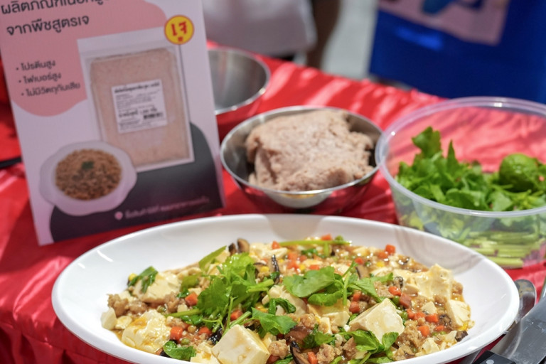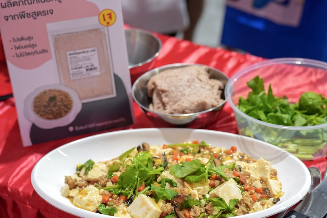 สำหรับเมนูที่เชฟโน้ต เลือกมาสาธิตให้ผู้ร่วมเวิร์กชอปได้ลงมือปรุงกัน เขาคัดเลือกวัตถุดิบแบบจัดเต็ม ไม่ว่าจะเป็น “แกงเทโพ เจ” ที่มีพระเอกคือ โปรตีนเกษตร โยตา, ผักบุ้งเทโพ, เห็ดหลินขาว, เห็ดหูหนูดำ ส่วน “เต้าหู้น้ำแดง เจ” ชูโรงด้วย เนื้อบดจากพืช Meatly! แพลนต์เบสโปรตีนพรีเมียมจาก “เบทาโกร”, เต้าหู้ขาวคินุ, ผักเต๋า 3 สี, เห็ดหอมแห้งเจียว
