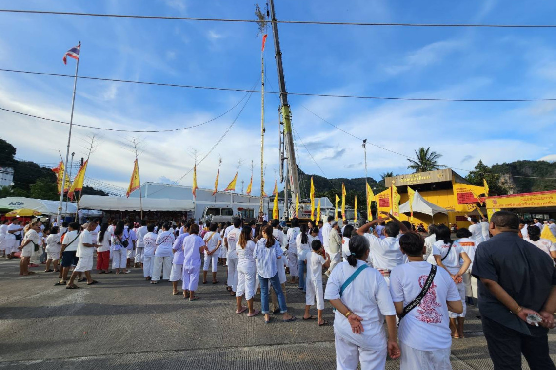 ชาวพังงาร่วมยกเสาโกเต้งสูงที่สุดในโลก ที่ศาลเจ้าแม่ม่าจ้อโป๋ เริ่มประเพณีถือศีล-กินผัก ปี 2567
