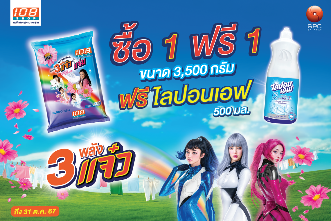 “ผงซักฟอก 108 Shop 3 แจ๋ว” ชนะขาดทุกงานซัก ขจัดได้ทั้งคราบหนักและคราบเบา ให้ผ้าขาวสะอาด มีกลิ่นหอมติดผ้า ผู้ช่วยมือหนึ่งของคุณแม่บ้าน จัดโปรโมชันสุดพิเศษ! ซื้อผงซักฟอก 108 Shop 3 แจ๋ว ถุงสีฟ้า ขนาด 3,500 กรัม รับฟรีทันที น้ำยาล้างจานไลปอนเอฟ ขนาด 500 มล. ตั้งแต่วันนี้ถึง 31 ตุลาคม 2567 เท่านั้น