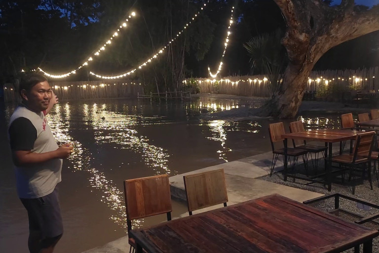 จากการสอบถาม นายธนะชัย ทองคำ เจ้าของร้านฯ กล่าวว่า ตั้งแต่ 6 โมงเย็นน้ำจะเริ่มขึ้นแล้ว โดยจะขึ้นประมาณ 4 - 5 ทุ่ม จะค่อยๆ ลง จนถึง 6 โมงเช้า น้ำจะทรงตัว และช่วงเย็นก็จะเริ่มขึ้นอีก โดยน้ำจะขึ้นมาถึงบริเวณโซนที่ 1 ของร้าน ส่วนโซนที่ 2 ของร้านจมหมดแล้ว แต่น้ำจะขึ้นๆ ลงๆ เพราะฝั่งนั้นจะต่ำกว่าโซน 1 ประมาณ 10 เซนติเมตร ทางร้านเราได้รับผลกระทบจากน้ำเอ่อล้นริมตลิ่งเมื่อวันที่ 30 สิงหาคมที่ผ่านมา หลังจากโพสคลิปบรรยากาศร้านที่ถูกน้ำท่วมลูกค้าก็ชื่นชอบ แต่เราก็ต้องประเมินสถานการณ์วันต่อวัน และติดตามข่าวสารตลอด ดูว่าน้ำจะขึ้นมากกว่านี้หรือไม่ หากพบว่าน้ำขึ้นมากกว่าปกติแต่ไม่ลงก็ต้องเตรียมยกของขึ้นที่สูง ปีที่พ้นมาน้ำไม่ท่วม ซึ่งทางร้านได้รับผลกระทบหนักเลยคือ ปี64 และ ปี65 น้ำท่วมเยอะ