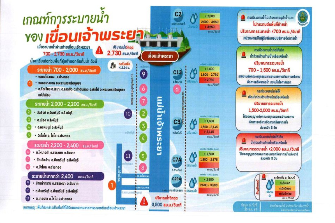 ซึ่งจะทำให้พื้นที่ลุ่มต่ำนอกคันกั้นน้ำ บริเวณคลองโผงเผง จ.อ่างทอง, คลองบางบาล จ.พระนครศรีอยุธยา และตำบลหัวเวียง อำเภอเสนา ตำบลลาดชิด ตำบลท่าดินแดง อำเภอผักไห่ จ.พระนครศรีอยุธยา (แม่น้ำน้อย), วัดสิงห์ อำเภออินทร์บุรี จ.สิงห์บุรี อำเภอเมืองสิงห์บุรี อำเภอพรหมบุรี จ.สิงห์บุรี, วัดไชโย อำเภอไชโย จ.อ่างทอง, ตำบลโพนางดำ อำเภอสรรพยา จ.ชัยนาท, วัดเสือข้าม อำเภออินทร์บุรี จ.สิงห์บุรี และอำเภอป่าโมก จ.อ่างทอง อาจส่งผลกระทบต่อพื้นที่ชุมชน ตั้งแต่วันที่ 6 ตุลาคม 2567 เป็นต้นไป
