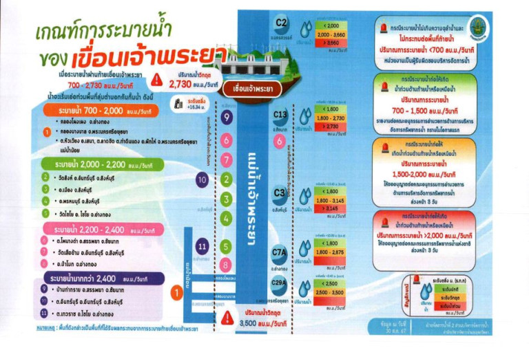 ทั้งนี้ จะทำให้ปริมาณน้ำที่เหนือเขื่อนเจ้าพระยา มีปริมาณ 2,800 ลูกบาศก์เมตรต่อวินาที และรับน้ำเข้าระบบกรมชลประทาน ทั้ง 2 ฝั่ง ในอัตรา 400 ลูกบาศก์เมตรต่อวินาที จึงมีความจำเป็นต้องระบายน้ำผ่านท้ายเขื่อนเจ้าพระยา ในอัตราไม่เกิน 2,400 ลูกบาศก์เมตรต่อวินาที โดยจะมีการระบายเพิ่มขึ้นแบบขั้นบันได ซึ่งส่งผลให้พื้นที่ริมน้ำมีระดับน้ำเพิ่มสูงขึ้นจากปัจจุบันอีกประมาณ 0.60-0.70 เมตร